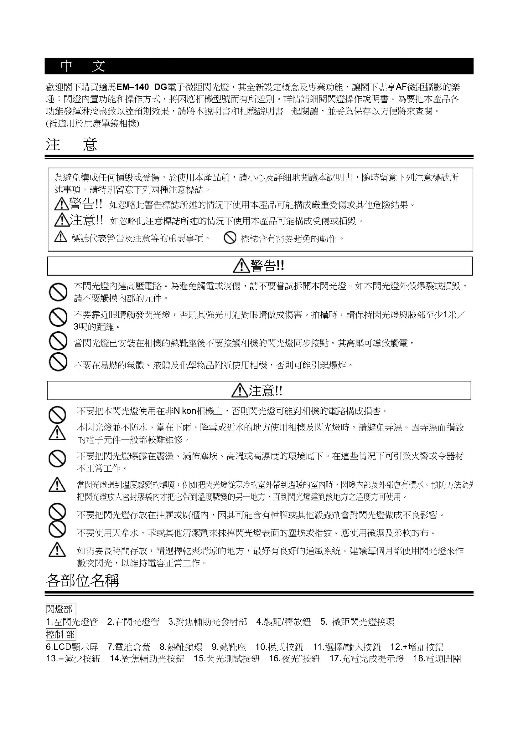 歡迎閣下購買適馬EM–140 DG電子微距閃光燈,其全新設定概念及專業功能,讓閣下盡享AF微距攝影的樂 趣;閃燈內置功能和操作方式,將因應相機型號而有所差別。詳情請細閱閃燈操作說明書。為要把本產品各 功能發揮淋漓盡致以達預期效果,請將本說明書和相機說明書一起閱讀,並妥為保存以方便將來查閱。 (祗適用於尼康單鏡相機)