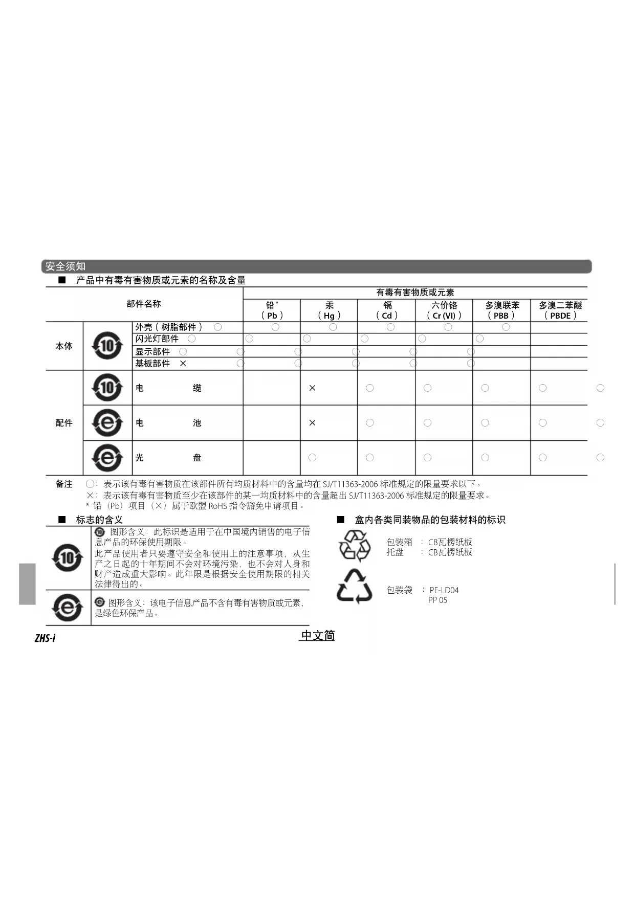 ○: 表示该有毒有害物质在该部件所有均质材料中的含量均在 SJ/T11363-2006 标准规定的限量要求以下。 ×: 表示该有毒有害物质至少在该部件的某一均质材料中的含量超出 SJ/T11363-2006 标准规定的限量要求。