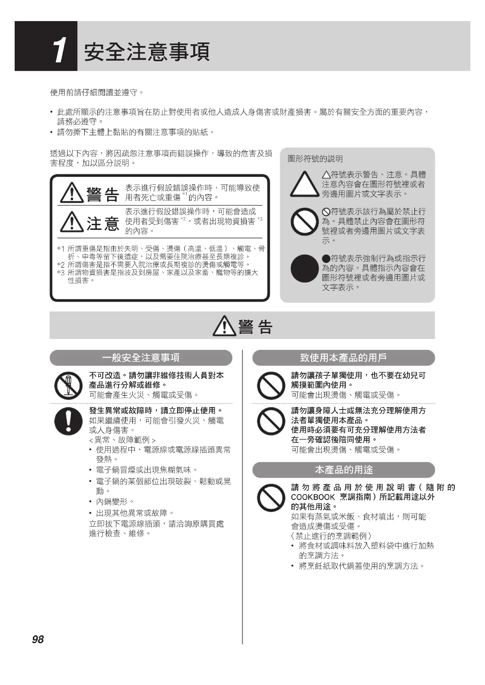 出現其他異常或故障。立即拔下電源線插頭,請洽詢原購買處進行檢查、維修。 請勿讓孩子單獨使用,也不要在幼兒可觸摸範圍內使用。可能會出現燙傷、觸電或受傷。請勿讓身障人士或無法充分理解使用方法者單獨使用本產品。使用時必須要有可充分理解使用方法者在一旁確認後陪同使用。可能會出現燙傷、觸電或受傷。 請 勿 將 產 品 用 於 使 用 說 明 書( 隨 附 的COOKBOOK 烹調指南)所記載用途以外的其他用途。如果有蒸氣或米飯、食材噴出,則可能會造成燙傷或受傷。〈禁止進行的烹調範例〉 將食材或調味料放入塑料袋中進行加熱的烹調方法。 將烹飪紙取代鍋蓋使用的烹調方法。使用前請仔細閱讀並遵守。 此處所顯示的注意事項旨在防止對使用者或他人造成人身傷害或財產損害。屬於有關安全方面的重要內容,請務必遵守。