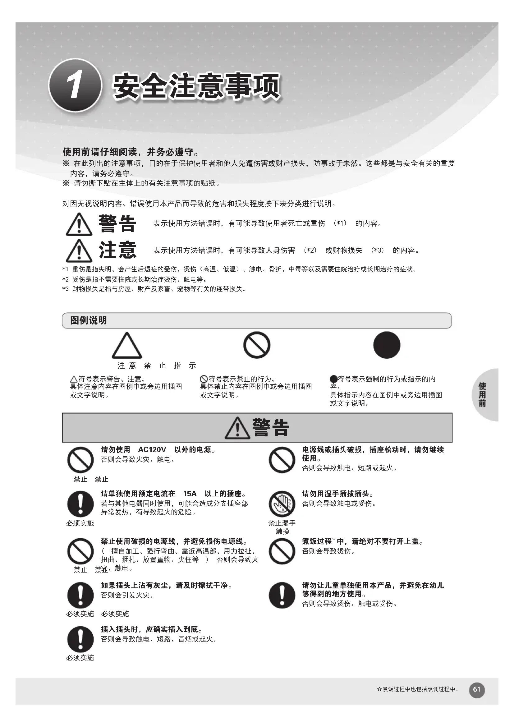 使用前请仔细阅读,并务必遵守。 ※在此列出的注意事项,目的在于保护使用者和他人免遭伤害或财产损失,防事故于未然。这些都是与安全有关的重要内容,请务必遵守。※请勿撕下贴在主体上的有关注意事项的贴纸。对因无视说明内容、错误使用本产品而导致的危害和损失程度按下表分类进行说明。 表示使用方法错误时,有可能导致使用者死亡或重伤 (*1) 的内容。 表示使用方法错误时,有可能导致人身伤害 (*2) 或财物损失 (*3) 的内容。*1重伤是指失明、会产生后遗症的受伤、烫伤(高温、低温)、触电、骨折、中毒等以及需要住院治疗或长期治疗的症状。*2受伤是指不需要住院或长期治疗烫伤、触电等。*3财物损失是指与房屋、财产及家畜、宠物等有关的连带损失。注意 禁 止 指 示符号表示警告、注意。具体注意内容在图例中或旁边用插图或文字说明。符号表示禁止的行为。具体禁止内容在图例中或旁边用插图或文字说明。符号表示强制的行为或指示的内 具体指示内容在图例中或旁边用插图或文字说明。 请勿使用 AC120V 以外的电源。否则会导致火灾、触电。电源线或插头破损,插座松动时,请勿继续 否则会导致触电、短路或起火。禁止 禁止请单独使用额定电流在 15A 以上的插座。若与其他电器同时使用,可能会造成分支插座部异常发热,有导致起火的危险。请勿用湿手插拔插头。否则会导致触电或受伤。