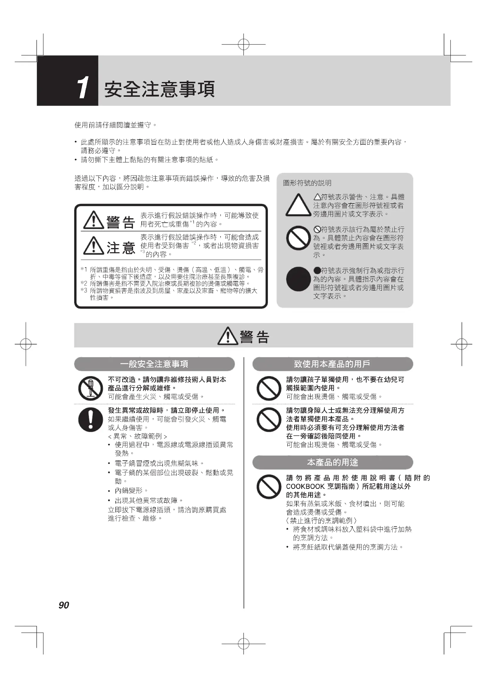 出現其他異常或故障。立即拔下電源線插頭,請洽詢原購買處進行檢查、維修。 請勿讓孩子單獨使用,也不要在幼兒可觸摸範圍內使用。可能會出現燙傷、觸電或受傷。請勿讓身障人士或無法充分理解使用方法者單獨使用本產品。使用時必須要有可充分理解使用方法者在一旁確認後陪同使用。可能會出現燙傷、觸電或受傷。 請 勿 將 產 品 用 於 使 用 說 明 書( 隨 附 的COOKBOOK烹調指南)所記載用途以外的其他用途。如果有蒸氣或米飯、食材噴出,則可能會造成燙傷或受傷。〈禁止進行的烹調範例〉 將食材或調味料放入塑料袋中進行加熱的烹調方法。 將烹飪紙取代鍋蓋使用的烹調方法。使用前請仔細閱讀並遵守。 此處所顯示的注意事項旨在防止對使用者或他人造成人身傷害或財產損害。屬於有關安全方面的重要內容,請務必遵守。 請勿撕下主體上黏貼的有關注意事項的貼紙。透過以下內容,將因疏忽注意事項而錯誤操作,導致的危害及損害程度,加以區分說明。