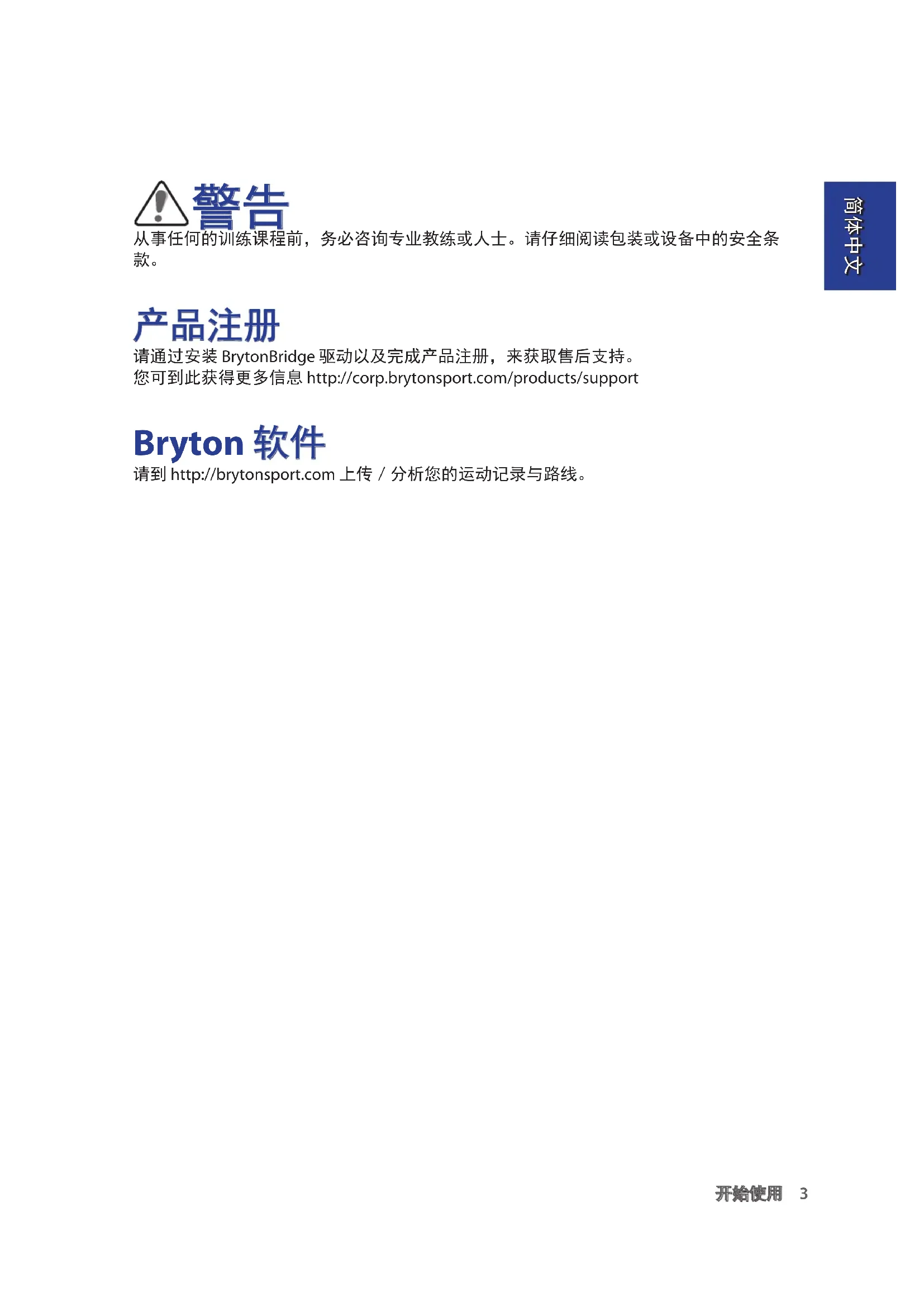 请通过安装 BrytonBridge 驱动以及完成产品注册,来获取售后支持。 您可到此获得更多信息 http://corp.brytonsport.com/products/support Bryton 软件 请到 http://brytonsport.com 上传/分析您的运动记录与路线。骑行时间 距离 开始使用4 您的 Rider 310