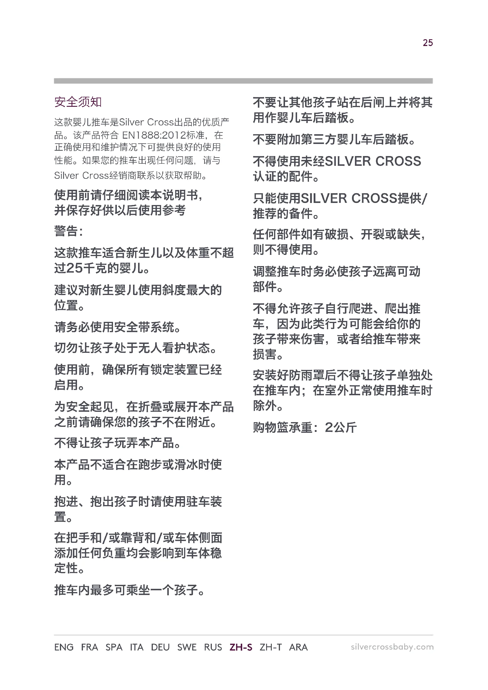 购物篮承重:2公斤26 ENG FRA SPA ITA DEU SWE RUS ZH-S ZH-T ARA 调整推车时请始终抓住座椅。始终开启停车 制动器。如果你收起、打开推车有困难,请 勿过于用力,因为这可能会造成损坏。仔细 阅读“收起、打开推车”说明部分。安装未 经Silver Cross提供、推荐的配件或备件可 能不安全。如果推车拥有者之外的其他人使 用推车(例如,爷爷奶奶、保姆),请告诉 他们如何正确使用推车。