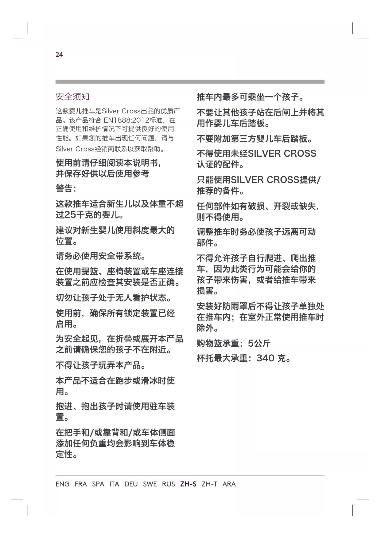 购物篮承重:5公斤 杯托最大承重:340 克。25 silvercrossbaby.com ENG FRA SPA ITA DEU SWE RUS ZH-S ZH-T ARA 调整推车时请始终抓住座椅。始终开启停车 制动器。如果你收起、打开推车有困难,请 勿过于用力,因为这可能会造成损坏。仔细 阅读“收起、打开推车”说明部分。安装未 经Silver Cross提供、推荐的配件或备件可 能不安全。如果推车拥有者之外的其他人使 用推车(例如,爷爷奶奶、保姆),请告诉 他们如何正确使用推车。