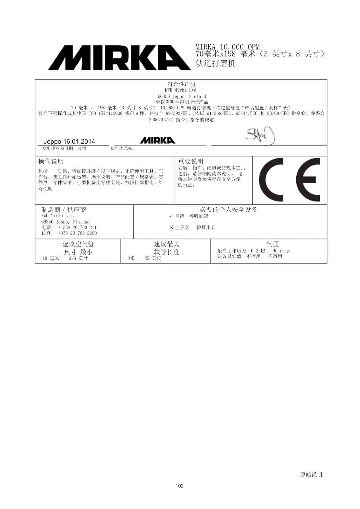 | 符合性声明 KWH Mirka Ltd. 66850 Jeppo, Finland 全权声明本声明所涉产品 70毫米 x 198毫米 (3英寸 8英寸) 10,000 OPM轨道打磨机(特定型号见“产品配置/规格”表) 符合下列标准或其他EN ISO 15744:2008规范文件,并符合89/392/EEC(依据91/368/EEC、93/44/EEC和93/68/EEC指令修订并整合2006/42/EC指令)指令的规定 Jeppo 16.01.2014 MIRKA | ||||