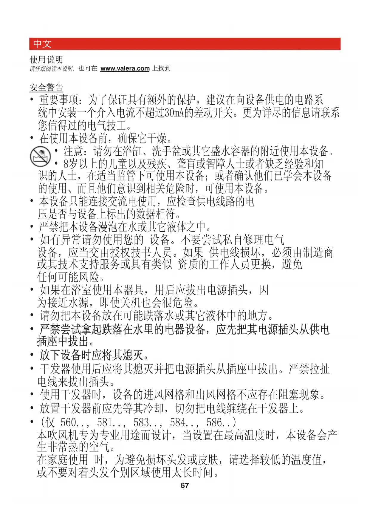 的公共设施、健身房、康体/健身中心、俱 乐部、水疗中心等安装及使用,Valera公司建议仅采用以下型号 的设备:SN9000 P • 583.11/P • 584.02/IP。 没有静电荷或“fly away(竖立)” 负荷离子有助于减少静电、头发“fly away (竖立)”及卷曲现象。