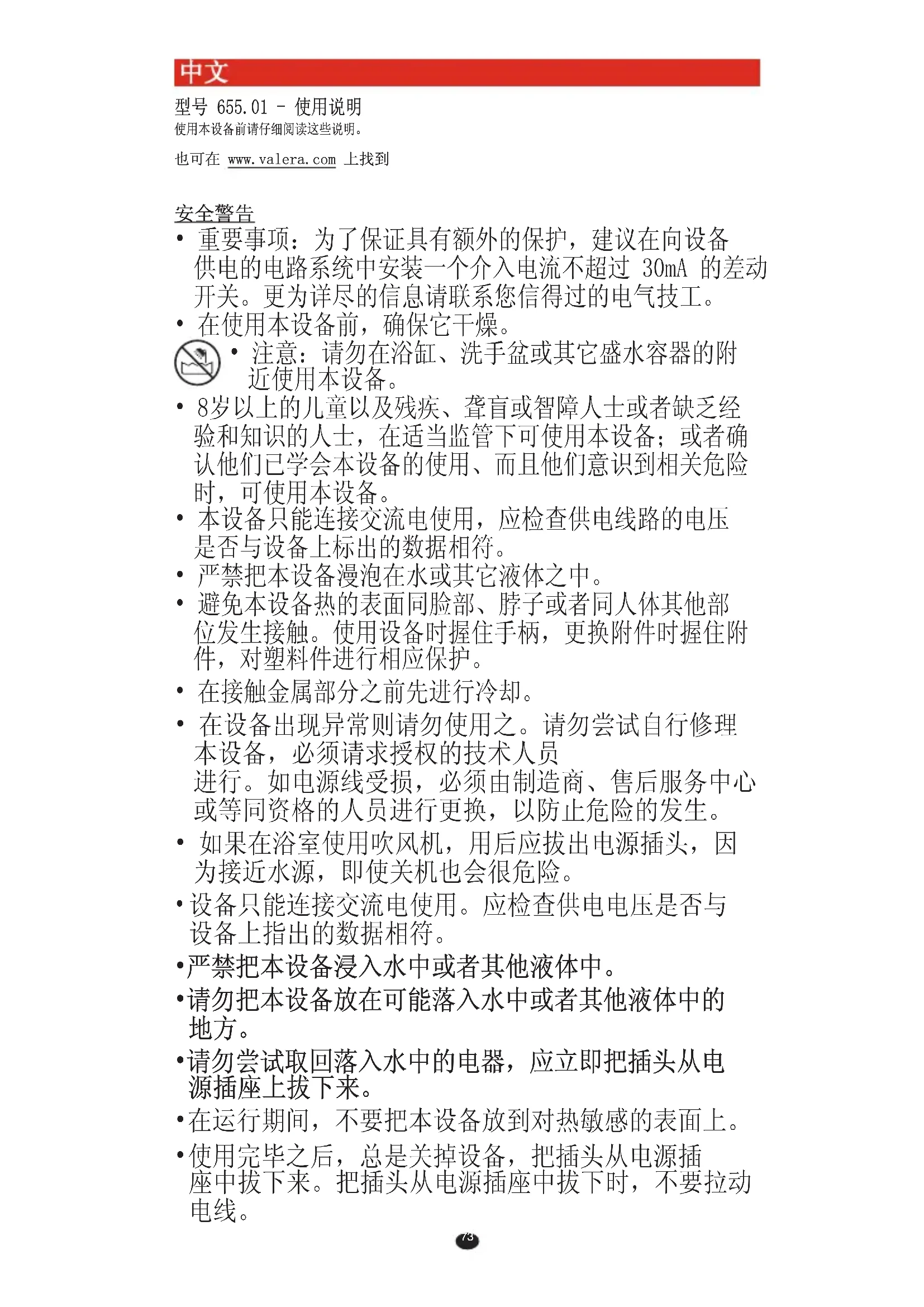 00060587 int_ott2014 02/10/2014 8.29 Pagina 7273 型号 655.01 - 使用说明 使用本设备前请仔细阅读这些说明。 也可在 www.valera.com 上找到