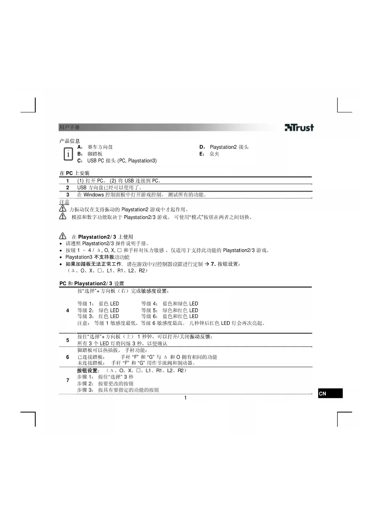 - 如果加踏板无法正常工作,请在游戏中对控制器设置进行定制 Æ 7. 按钮设置: (Δ、O、X、、L1、R1、L2、R2) PC 和 Playstation2/3 设置 按“选择”+方向板(右)完成敏感度设置: 等级 1: 蓝色 LED 等级 4: 蓝色和绿色 LED 等级 2: 绿色 LED 等级 5: 绿色和红色 LED 等级 3: 红色 LED 等级 6: 蓝色和红色 LED 注意: 等级 1 敏感度最低,等级 6 敏感度最高。 几秒钟后红色 LED 灯会再次亮起。