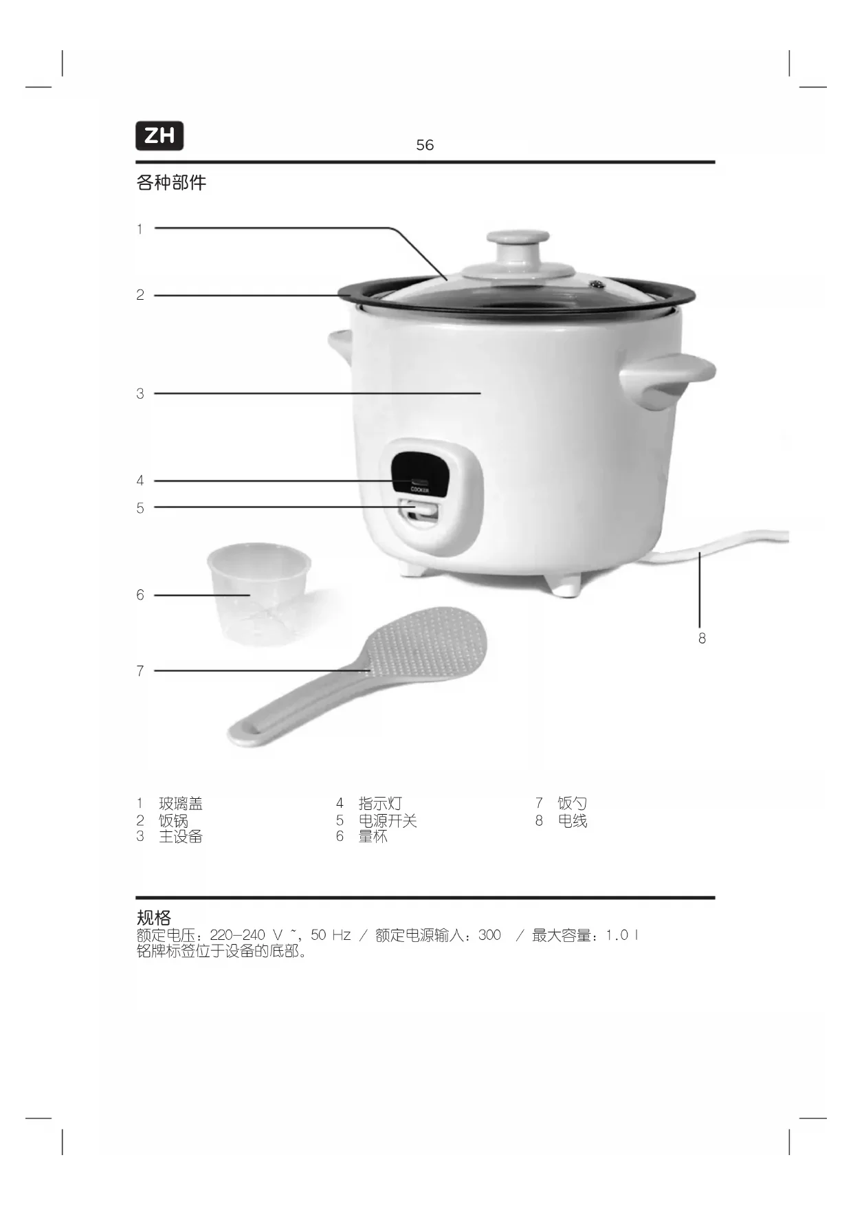 1 玻璃盖 2 饭锅 3 主设备 4 指示灯 5 电源开关 6 量杯 7 饭勺 8 电线
