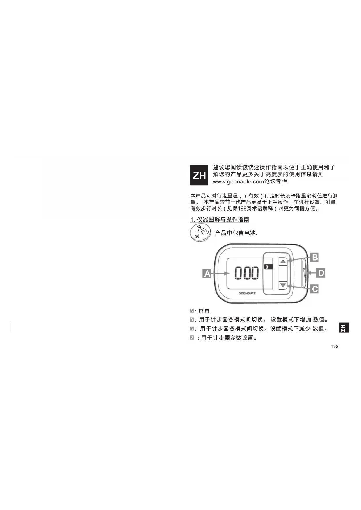 建議您閱讀該快速操作指南以便於正確使用和瞭 解您的產品. 更多關於高度表的使用信息請見 www.geonaute.com論壇專欄 本產品可對行走裏程,(有效)行走時長及卡路裏消耗值進行 測量。 本產品較上一代產品更易於上手操作,在進行設置、 測量有效行走時長(見第211頁術語解釋)時更為簡捷方便。