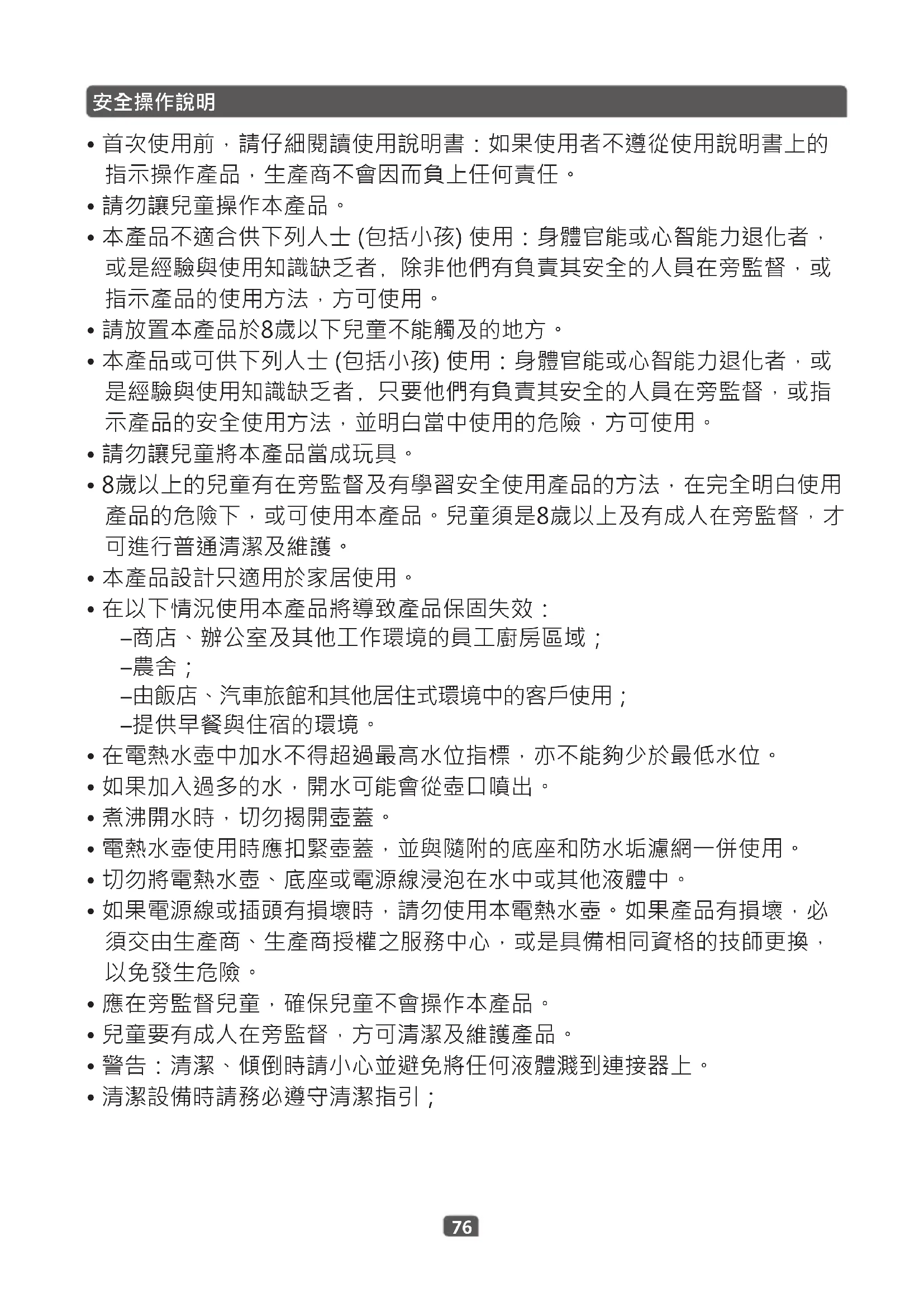 - 本產品不適合供下列人士(包括小孩)使用:身體官能或心智能力退化者, 或是經驗與使用知識缺乏者﹐除非他們有負責其安全的人員在旁監督,或 指示產品的使用方法,方可使用。