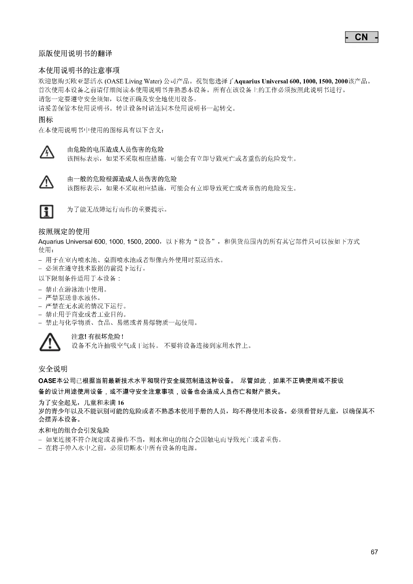本使用说明书的注意事项 欢迎您购买欧亚瑟活水 (OASE Living Water) 公司产品。祝贺您选择了Aquarius Universal 600, 1000, 1500, 2000该产品。 首次使用本设备之前请仔细阅读本使用说明书并熟悉本设备。所有在该设备上的工作必须按照此说明书进行。 请您一定要遵守安全须知,以便正确及安全地使用设备。 请妥善保管本使用说明书。转让设备时请连同本使用说明书一起转交。
