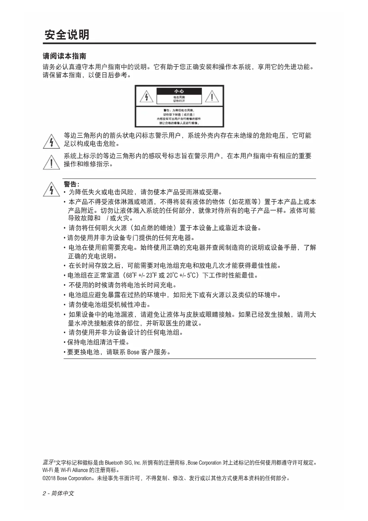 文字标记和徽标是由 Bluetooth SIG, Inc. 所拥有的注册商标,Bose Corporation 对上述标记的任何使用都遵守许可规定。 Wi-Fi 是 Wi-Fi Alliance 的注册商标。 ©2018 Bose Corporation。未经事先书面许可,不得复制、修改、发行或以其他方式使用本资料的任何部分。简体中文 - 3