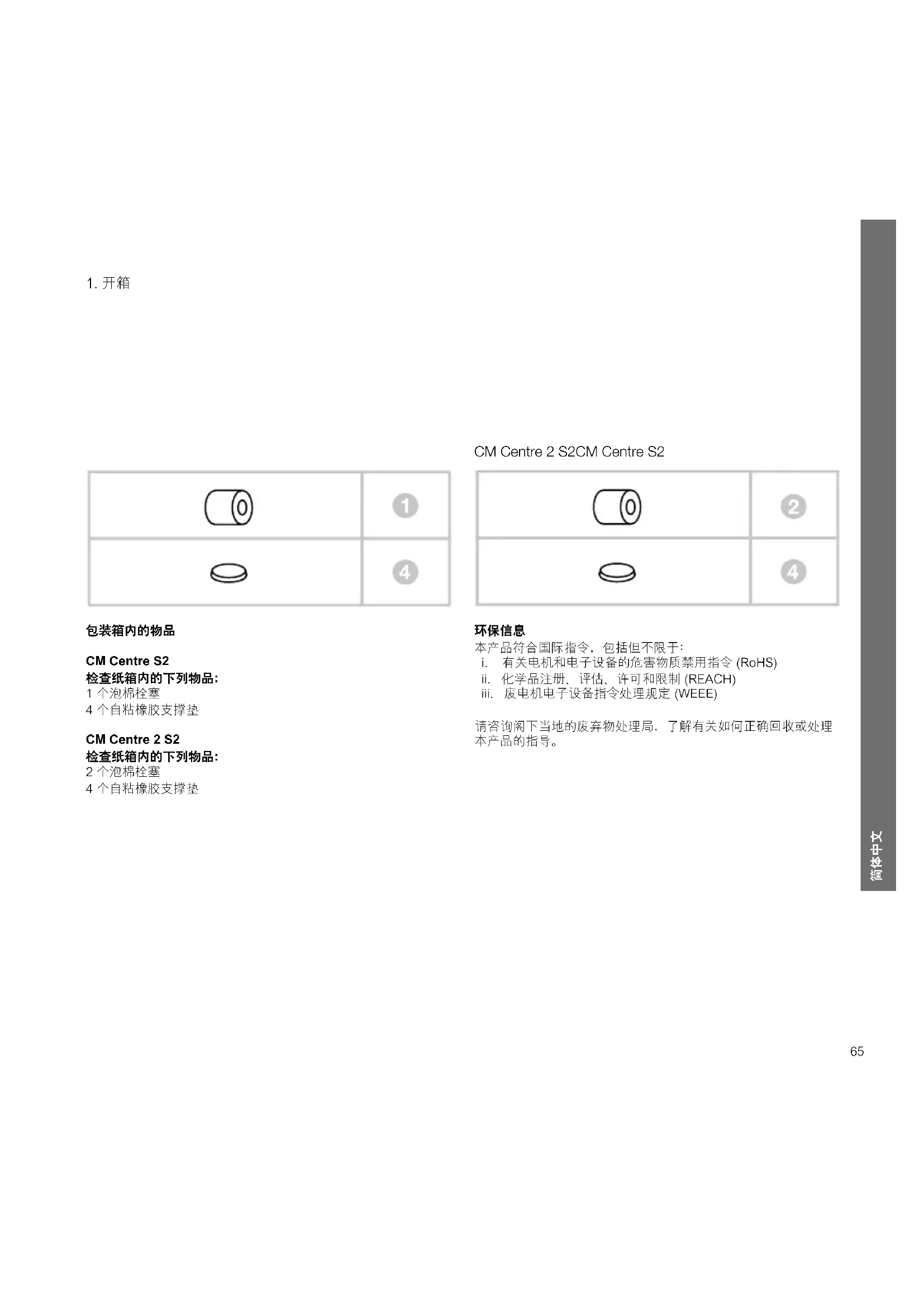 CM Centre S2 检查纸箱内的下列物品: 1 个泡棉栓塞 4 个自粘橡胶支撑垫 CM Centre 2 S2 检查纸箱内的下列物品: 2 个泡棉栓塞 4 个自粘橡胶支撑垫