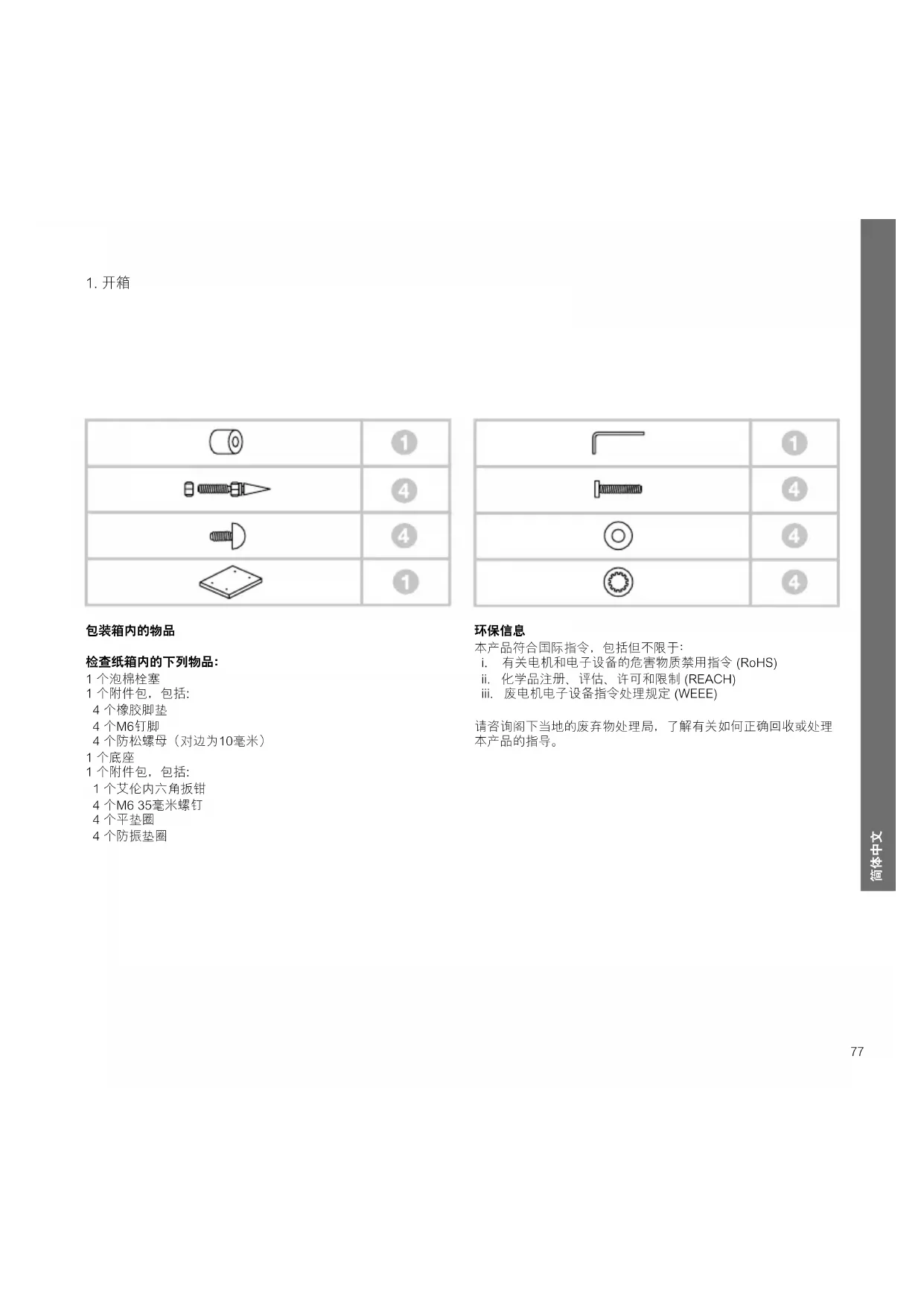 检查纸箱内的下列物品: 1 个泡棉栓塞 1 个附件包,包括: 4 个橡胶脚垫 4 个M6钉脚 4 个防松螺母(对边为10毫米) 1 个底座 1 个附件包,包括: 1 个艾伦内六角扳钳 4 个M6 35毫米螺钉 4 个平垫圈 4 个防振垫圈