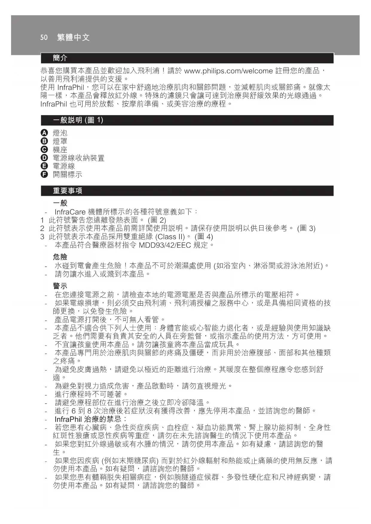 恭喜您購買本產品並歡迎加入飛利浦!請於 www.philips.com/welcome 註冊您的產品, 以善用飛利浦提供的支援。 使用 InfraPhil,您可以在家中舒適地治療肌肉和關節問題,並減輕肌肉或關節痛。就像太 陽一樣,本產品會釋放紅外線。特殊的濾鏡只會讓可達到治療與舒緩效果的光線通過。 InfraPhil 也可用於放鬆、按摩前準備、或美容治療的療程。 一般說明 (圖 1) A 燈泡 B 燈罩 C 機座 D 電源線收納裝置 E 電源線 F 開關標示
