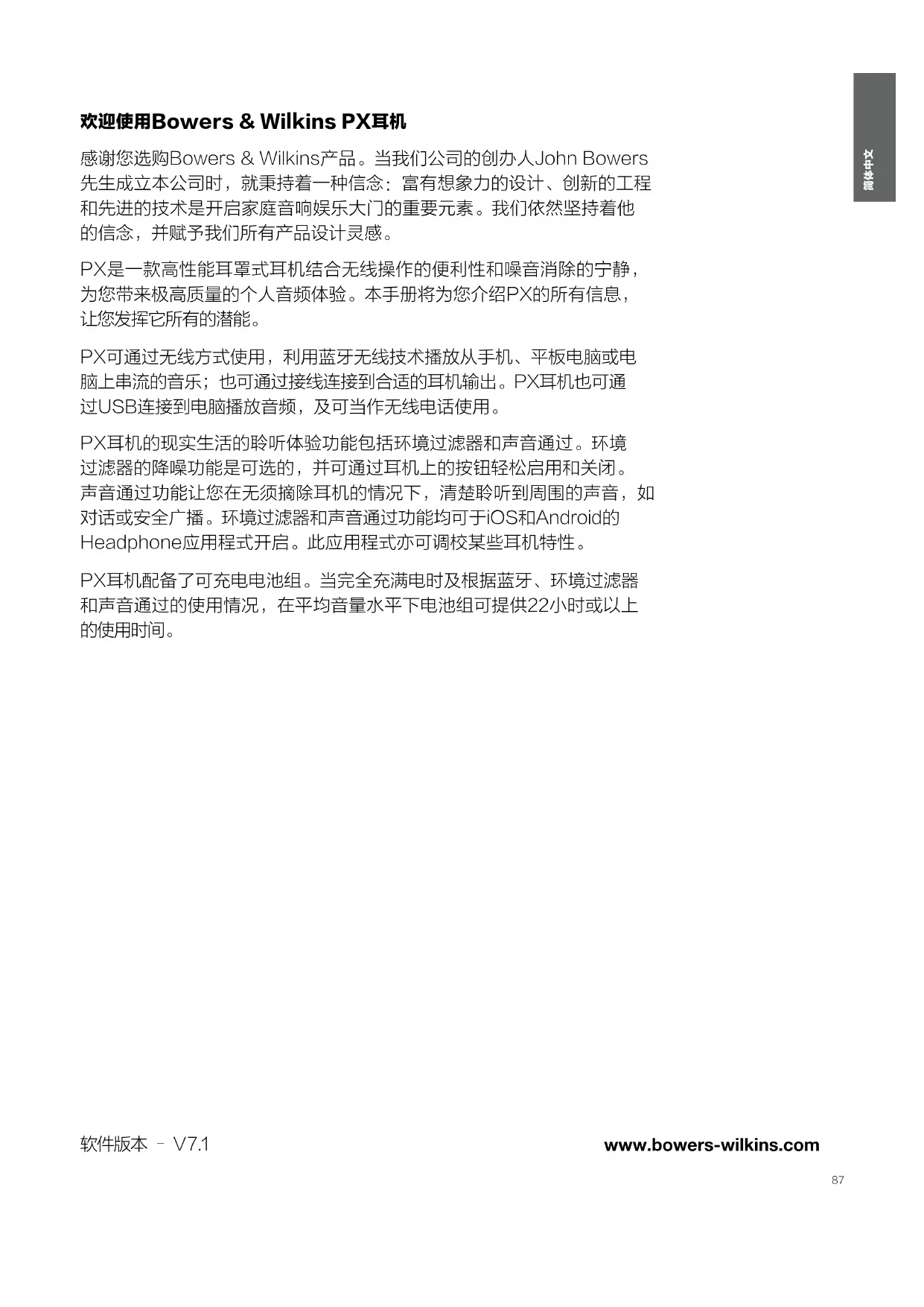 www.bowers-wilkins.com 欢迎使用Bowers & Wilkins PX耳机 感谢您选购Bowers & Wilkins产品。当我们公司的创办人John Bowers 先生成立本公司时,就秉持着一种信念:富有想象力的设计、创新的工程 和先进的技术是开启家庭音响娱乐大门的重要元素。我们依然坚持着他 的信念,并赋予我们所有产品设计灵感。 PX是一款高性能耳罩式耳机结合无线操作的便利性和噪音消除的宁静, 为您带来极高质量的个人音频体验。本手册将为您介绍PX的所有信息, 让您发挥它所有的潜能。 PX可通过无线方式使用,利用蓝牙无线技术播放从手机、平板电脑或电 脑上串流的音乐;也可通过接线连接到合适的耳机输出。PX耳机也可通 过USB连接到电脑播放音频,及可当作无线电话使用。 PX耳机的现实生活的聆听体验功能包括环境过滤器和声音通过。环境 过滤器的降噪功能是可选的,并可通过耳机上的按钮轻松启用和关闭。 声音通过功能让您在无须摘除耳机的情况下,清楚聆听到周围的声音,如 对话或安全广播。环境过滤器和声音通过功能均可于iOS和Android的 Headphone应用程式开启。此应用程式亦可调校某些耳机特性。 PX耳机配备了可充电电池组。当完全充满电时及根据蓝牙、环境过滤器 和声音通过的使用情况,在平均音量水平下电池组可提供22小时或以上