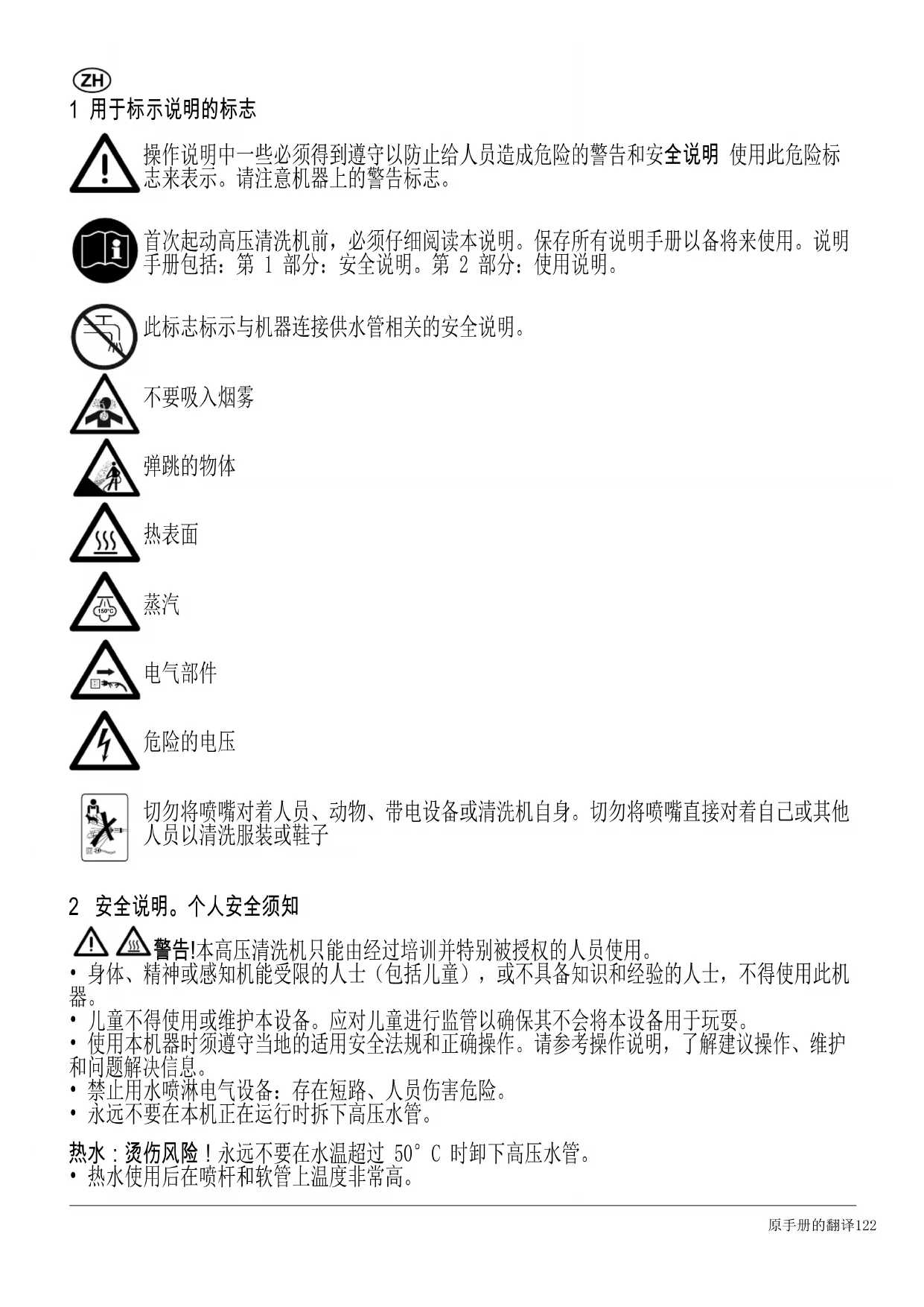 2 安全说明。个人安全须知 警告!本高压清洗机只能由经过培训并特别被授权的人员使用。