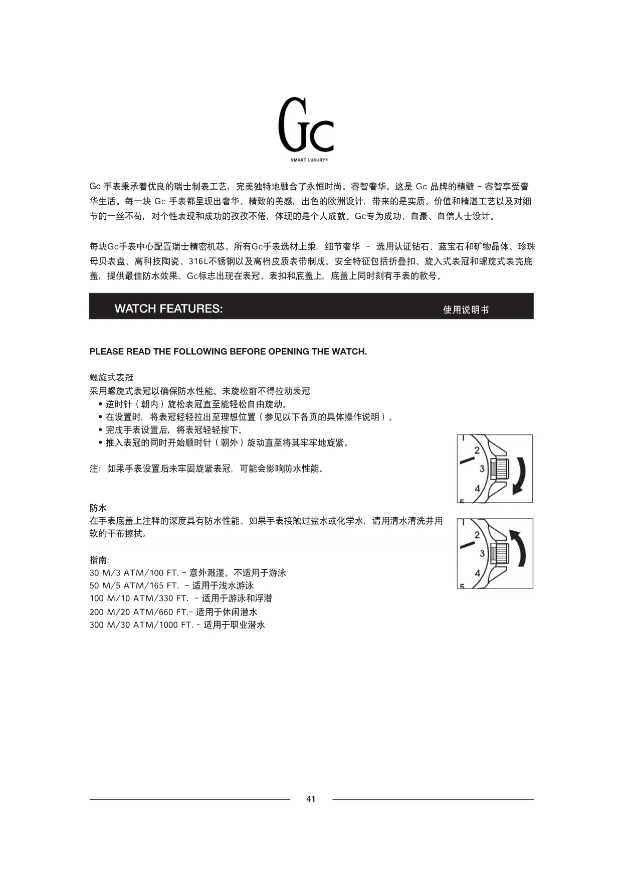 您的 Gc 自动计时表具有100米(10 ATM/330 英尺压强)的防水性能。如果手表接触过盐水或化学水,请用清水