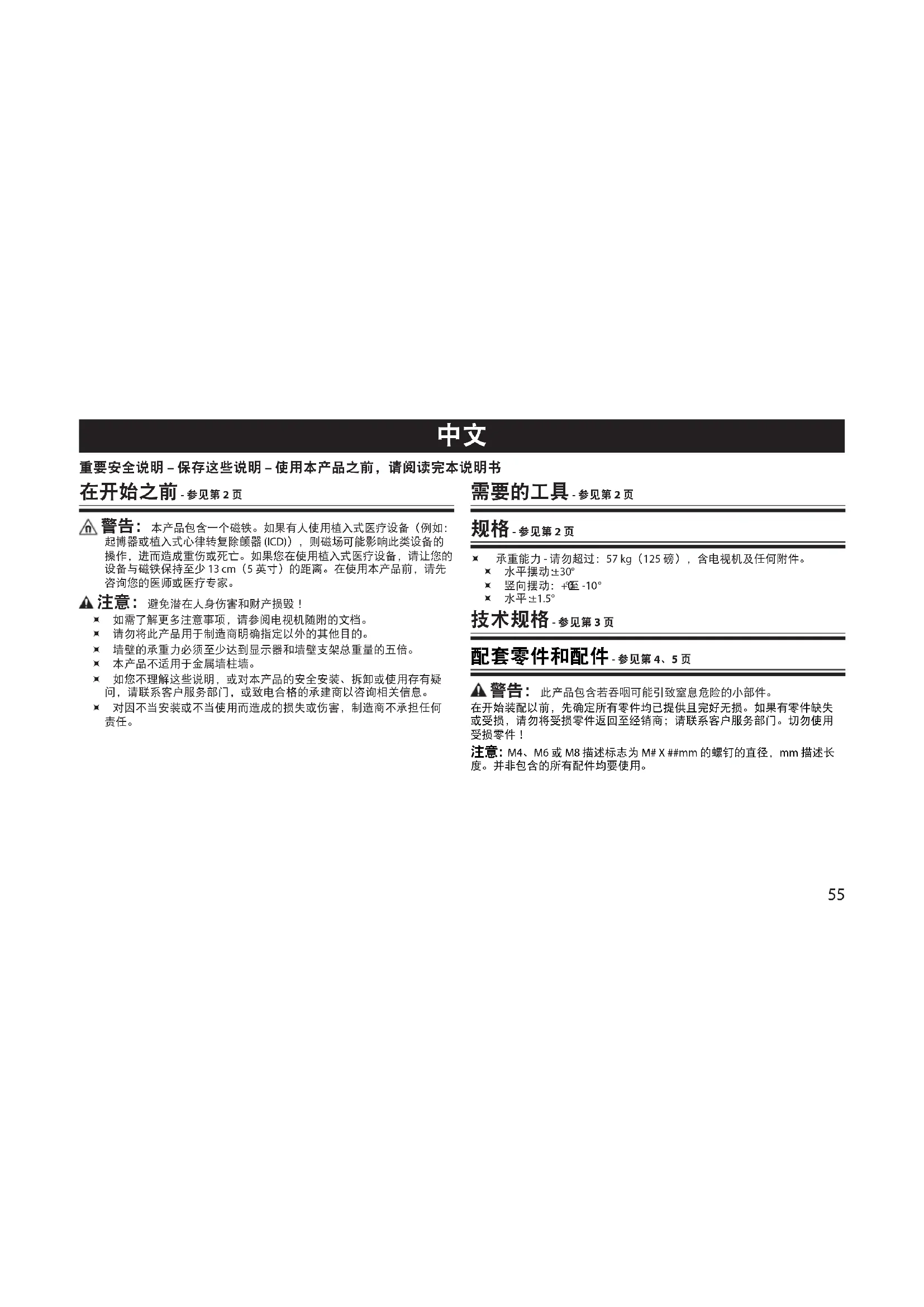 重要安全说明 – 保存这些说明 – 使用本产品之前,请阅读完本说明书 在开始之前 - 参见第 2 页 警告:本产品包含一个磁铁。如果有人使用植入式医疗设备(例如: 起博器或植入式心律转复除颤器 (ICD)),则磁场可能影响此类设备的 操作,进而造成重伤或死亡。如果您在使用植入式医疗设备,请让您的 设备与磁铁保持至少 13 cm(5 英寸)的距离。在使用本产品前,请先 咨询您的医师或医疗专家。 注意:避免潜在人身伤害和财产损毁! 如需了解更多注意事项,请参阅电视机随附的文档。 请勿将此产品用于制造商明确指定以外的其他目的。 墙壁的承重力必须至少达到显示器和墙壁支架总重量的五倍。 本产品不适用于金属墙柱墙。 如您不理解这些说明,或对本产品的安全安装、拆卸或使用存有疑 问,请联系客户服务部门,或致电合格的承建商以咨询相关信息。 对因不当安装或不当使用而造成的损失或伤害,制造商不承担任何