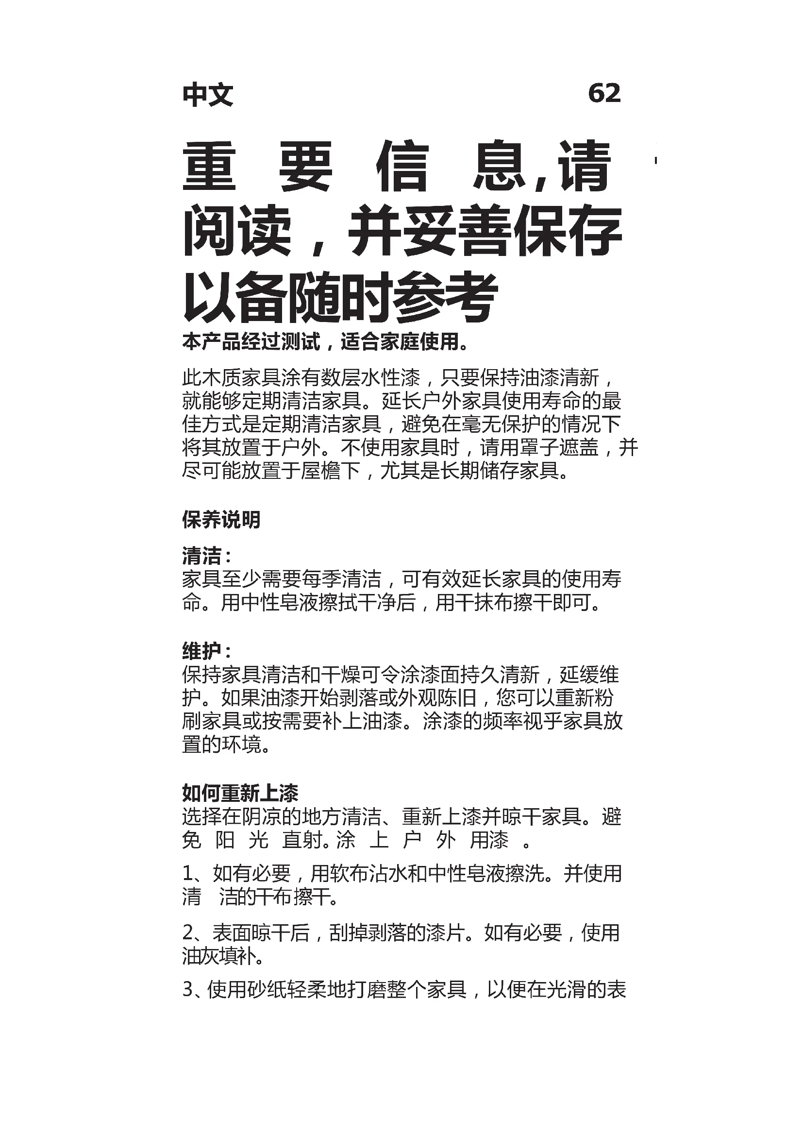 本产品经过测试,适合家庭使用。 此木质家具涂有数层水性漆,只要保持油漆清新, 就能够定期清洁家具。延长户外家具使用寿命的最 佳方式是定期清洁家具,避免在毫无保护的情况下 将其放置于户外。不使用家具时,请用罩子遮盖,并 尽可能放置于屋檐下,尤其是长期储存家具。