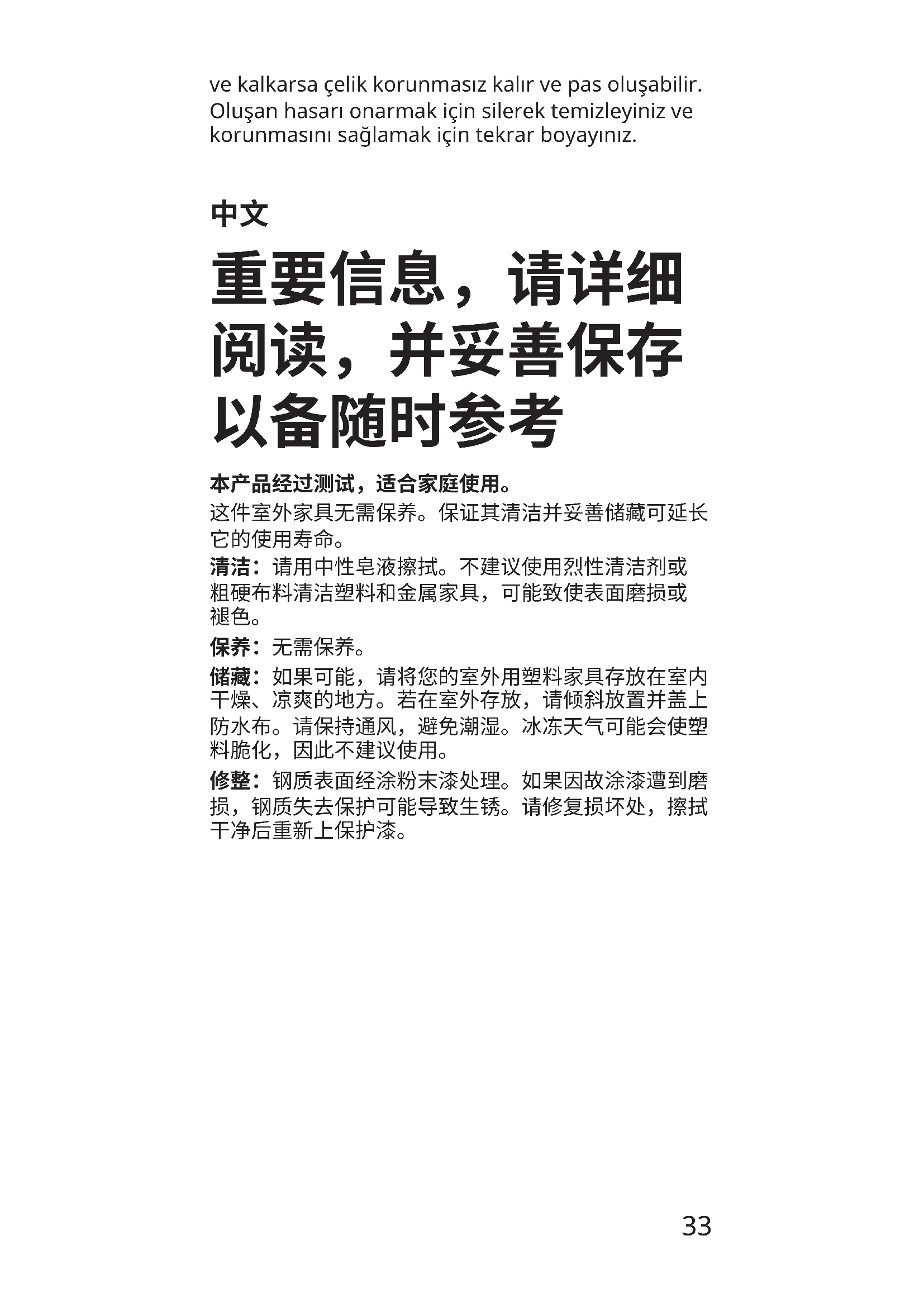 储藏:如果可能,请将您的室外用塑料家具存放在室内 干燥、凉爽的地方。若在室外存放,请倾斜放置并盖上 防水布。请保持通风,避免潮湿。冰冻天气可能会使塑 料脆化,因此不建议使用。 修整:钢质表面经涂粉末漆处理。如果因故涂漆遭到磨 损,钢质失去保护可能导致生锈。请修复损坏处,擦拭 干净后重新上保护漆。34