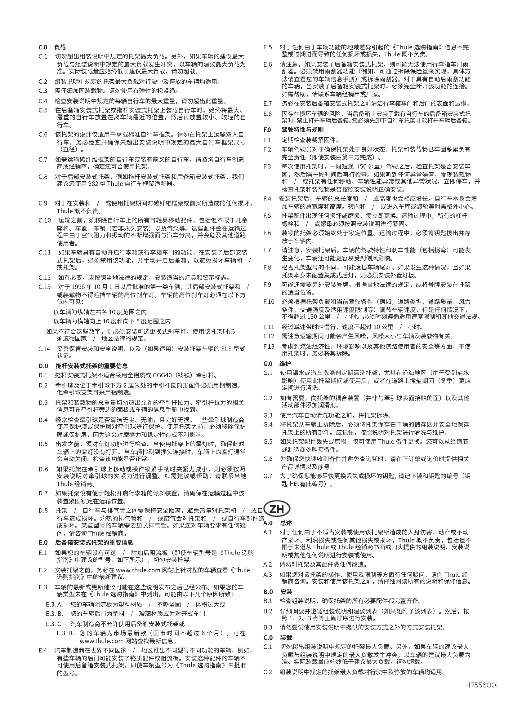 A.0 总述 A.1 对于任何由于不适当安装或使用该托架所造成的人身伤害、动产或不动 产损坏、利润损失或任何其他损失或损坏,Thule概不负责,包括但不 限于未遵从Thule或Thule经销商书面或口头提供的组装说明、安装说 明或其他任何说明进行安装或使用。 A.2 请勿对托架及其配件做任何改造。 A.3 如果您对该托架的操作、使用及限制等方面有任何疑问,请向Thule经 销商咨询。安装和使用该托架之前,请仔细阅读所有的说明和保修信息。 B.0 安装 B.1 检查组装说明,确保托架的所有必要配件都完整齐备。 B.2 仔细阅读并遵循组装说明和建议列表(如果随附建议列表)。然后,按 照1、2、3点等正确顺序进行安装。 B.3 请勿尝试使用安装说明中提供的安装方式之外的方式安装托架。475560032001 C.0 负载 C.1 切勿超出组装说明中规定的托架最大负载。另外,如果车辆的建议最大 负载与组装说明中规定的最大负载发生冲突,以车辆的建议最大负载为 准。实际装载量应始终低于建议最大负载,请勿超载。 C.2 组装说明中规定的托架最大负载对行驶中及停放的车辆均适用。 C.3 需仔细加固装载物。请勿使用有弹性的松紧绳。 C.4 检查安装说明中规定的每辆自行车的最大重量,请勿超出此重量。 C.5 在后备箱安装式托架或拖杆安装式托架上装载自行车时,始终将最大、 最重的自行车放置在离车辆最近的位置,然后再放置较小、较轻的自