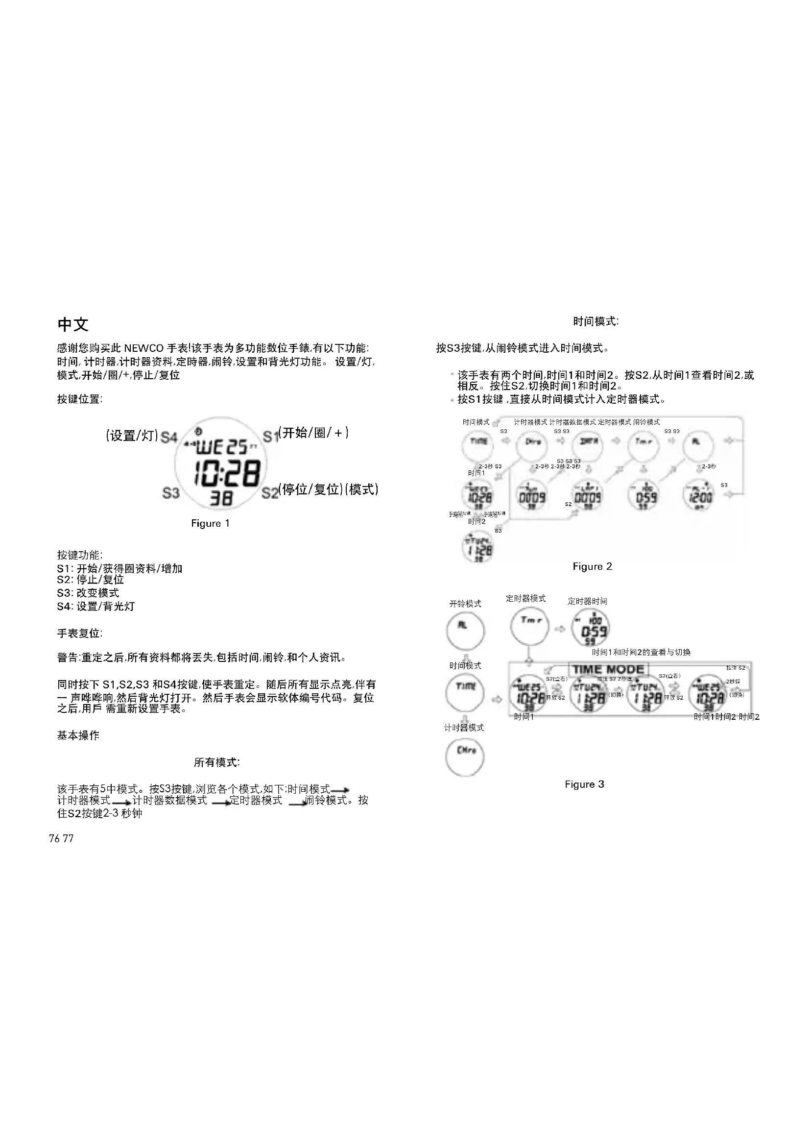 感谢您购买此 NEWCO 手表!该手表为多功能数位手錶,有以下功能: 时间, 计时器,计时器资料,定時器,闹铃,设置和背光灯功能。 设置/灯, 模式,开始/圈/+,停止/复位