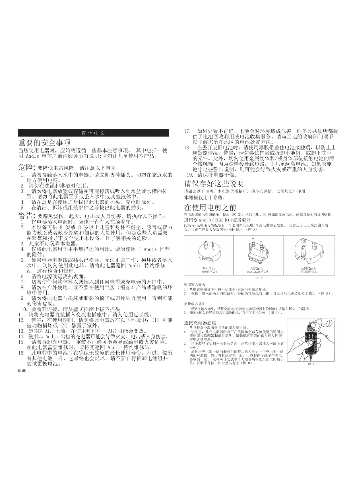 4.请勿尝试使用为此Andis电剪设计的充电器对其他电池充电