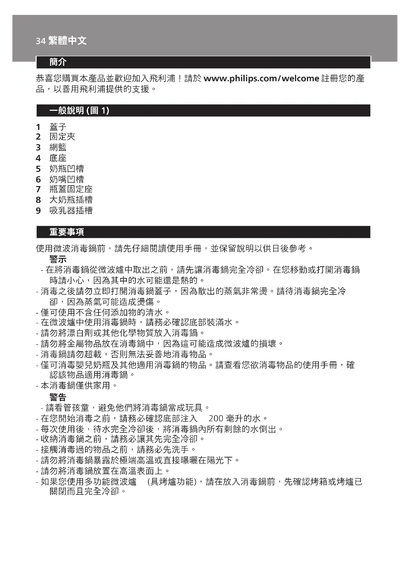 - 僅可使用不含任何添加物的清水。 - 在微波爐中使用消毒鍋時,請務必確認底部裝滿水。 - 請勿將漂白劑或其他化學物質放入消毒鍋。 - 請勿將金屬物品放在消毒鍋中,因為這可能造成微波爐的損壞。 - 消毒鍋請勿超載,否則無法妥善地消毒物品。 - 僅可消毒嬰兒奶瓶及其他適用消毒鍋的物品。請查看您欲消毒物品的使用手冊,確