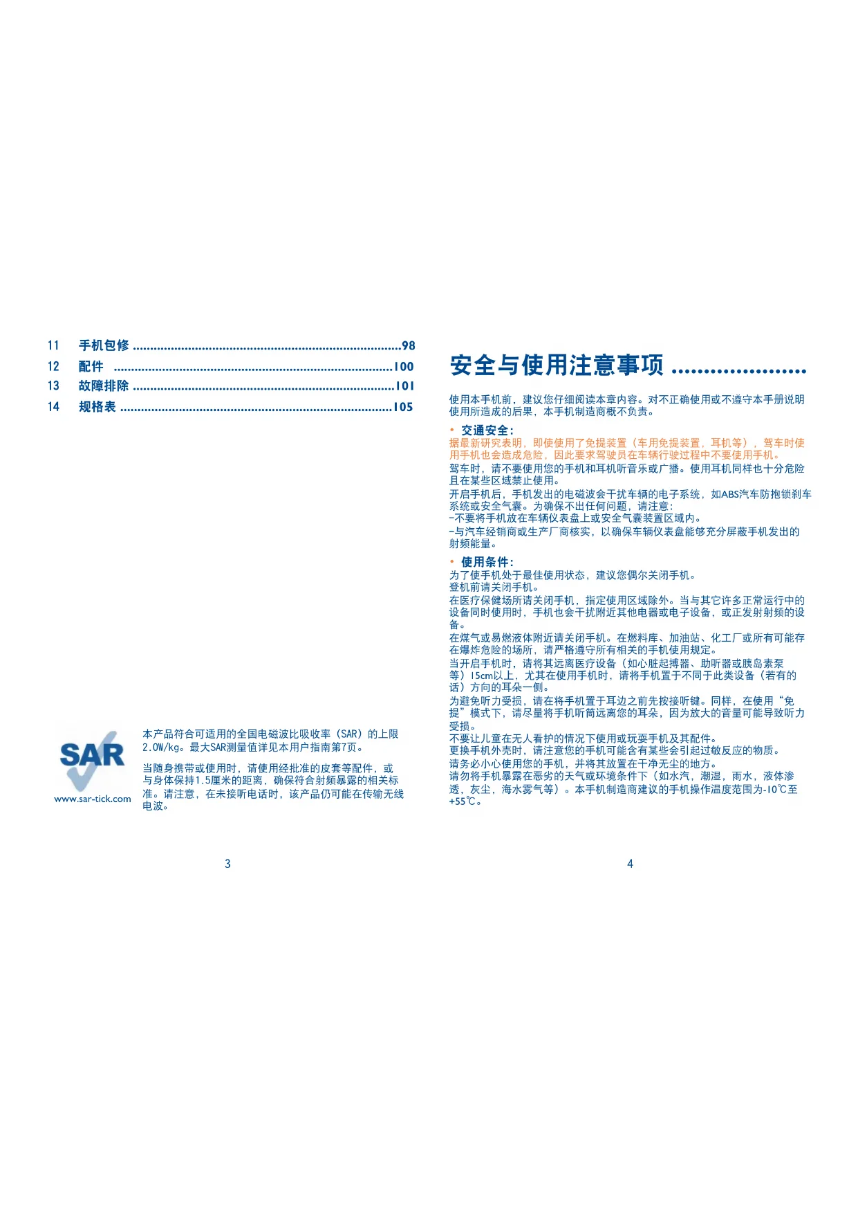安全与使用注意事项 ..................... 使用本手机前,建议您仔细阅读本章内容。对不正确使用或不遵守本手册说明 使用所造成的后果,本手机制造商概不负责。