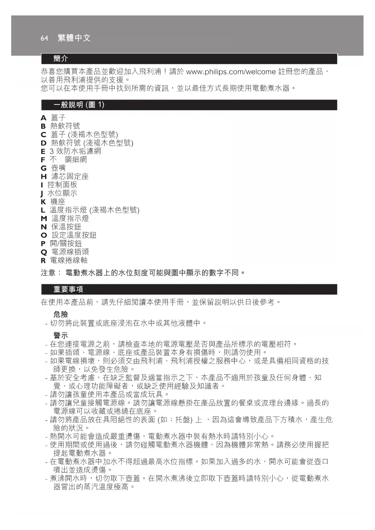 恭喜您購買本產品並歡迎加入飛利浦!請於 www.philips.com/welcome 註冊您的產品, 以善用飛利浦提供的支援。 您可以在本使用手冊中找到所需的資訊,並以最佳方式長期使用電動煮水器。 一般說明 (圖 1) a 蓋子 B 熱飲符號 C 蓋子 (淺褐木色型號) D 熱飲符號 (淺褐木色型號) E 3 效防水垢濾網 F 不銹鋼細網 g 壺嘴 H 濾芯固定座 i 控制面板 J 水位顯示 K 機座 l 溫度指示燈 (淺褐木色型號) M 溫度指示燈 n 保溫按鈕 o 設定溫度按鈕 p 開/關按鈕 Q 電源線插頭 r 電線捲線軸 注意: 電動煮水器上的水位刻度可能與圖中顯示的數字不同。