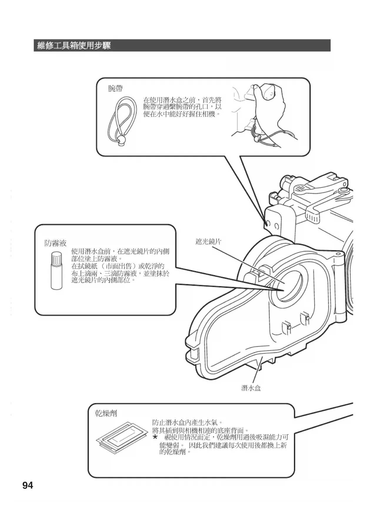 在底座的背面插入乾燥劑。 把底座裝到相機底部。z 將相機底部三角架螺絲孔對準底座的螺絲,旋緊螺絲。z 液晶顯示屏被打開時,相機電源會自動打開。請按住電源按鈕超過2秒鐘,關閉相機電源。 摺疊握帶。z 密閉時,切勿讓握帶卡在潛水盒中。