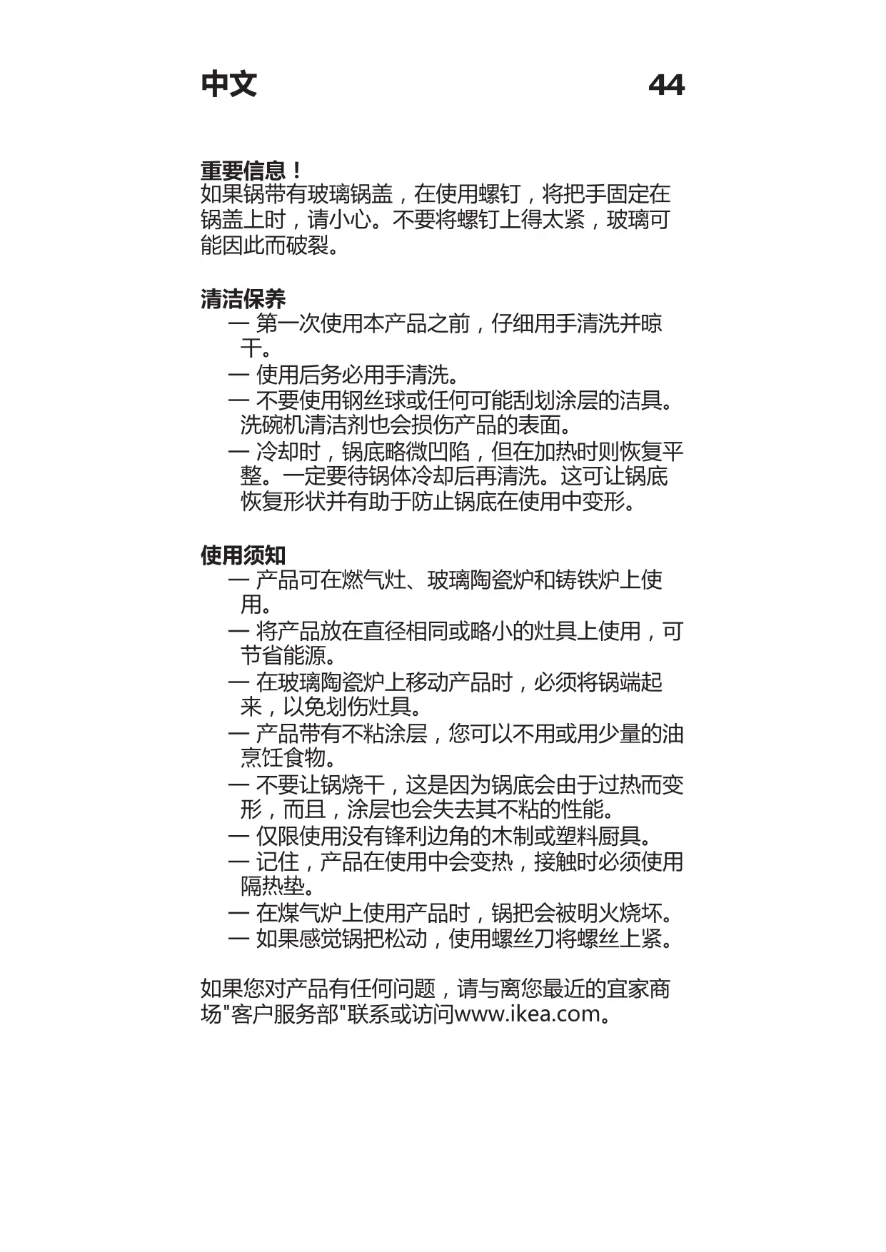 — 在煤气炉上使用产品时,锅把会被明火烧坏。 — 如果感觉锅把松动,使用螺丝刀将螺丝上紧。 如果您对产品有任何问题,请与离您最近的宜家商 场"客户服务部"联系或访问www.ikea.com。