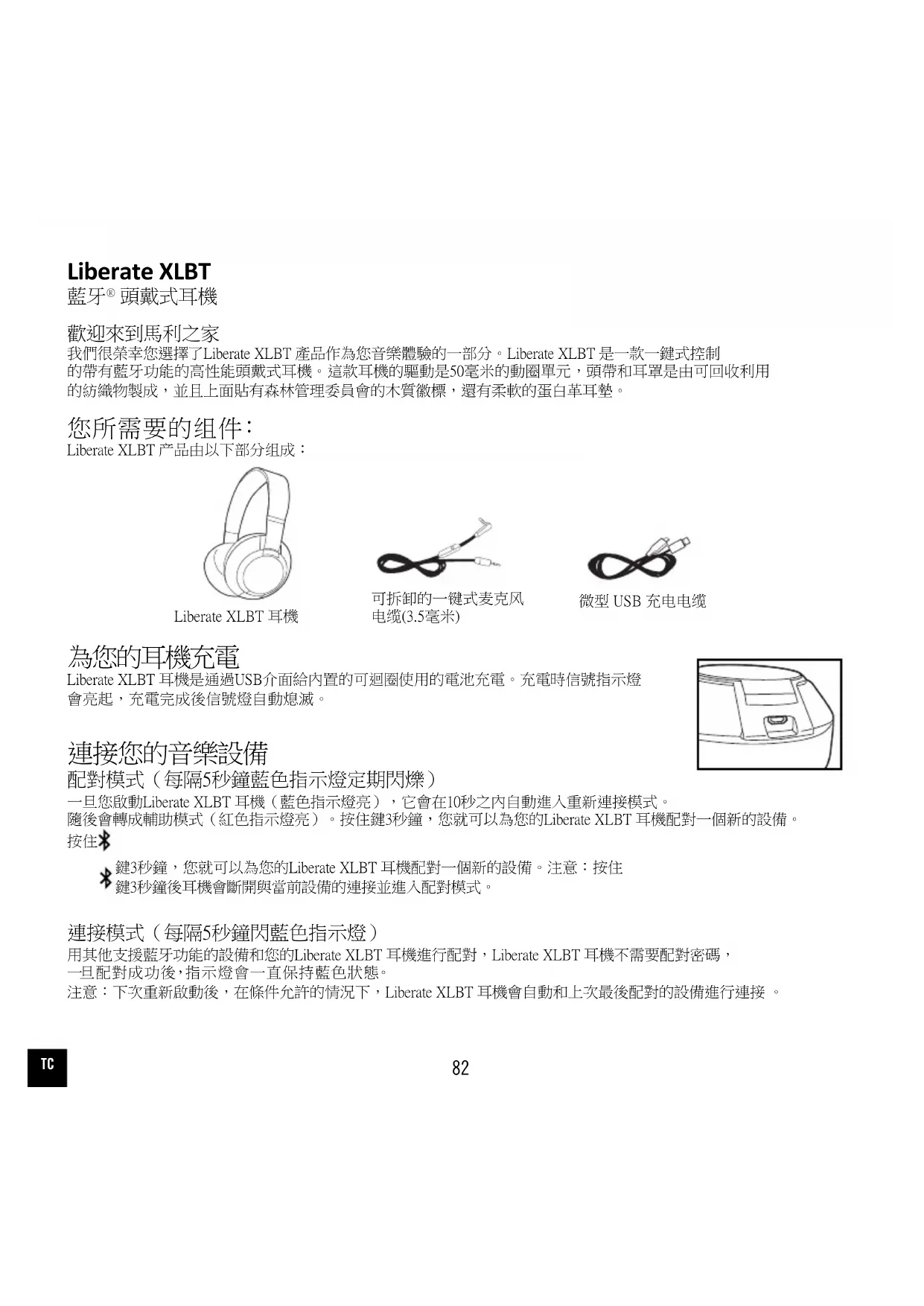 我們很榮幸您選擇了Liberate XLBT 產品作為您音樂體驗的一部分。Liberate XLBT 是一款一鍵式控制 的帶有藍牙功能的高性能頭戴式耳機。這款耳機的驅動是50毫米的動圈單元,頭帶和耳罩是由可回收利用 的紡織物製成,並且上面貼有森林管理委員會的木質徽標,還有柔軟的蛋白革耳墊。 您 所 需 要 的 组 件: Liberate XLBT 产品由以下部分组成: Liberate XLBT 耳機