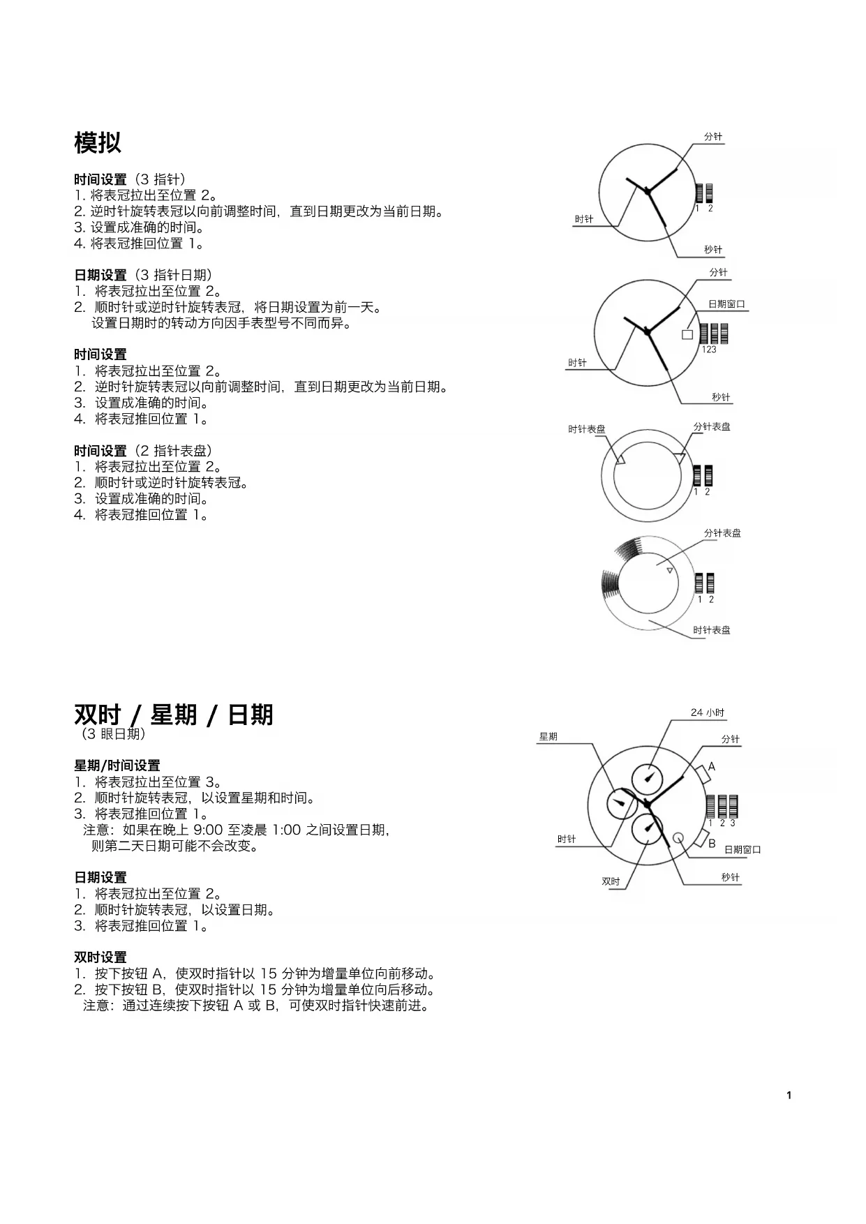 注意:24 小时指针将相应地随时针和分针转动。 在设置时间时,请确保 24 小时指针设置正确。