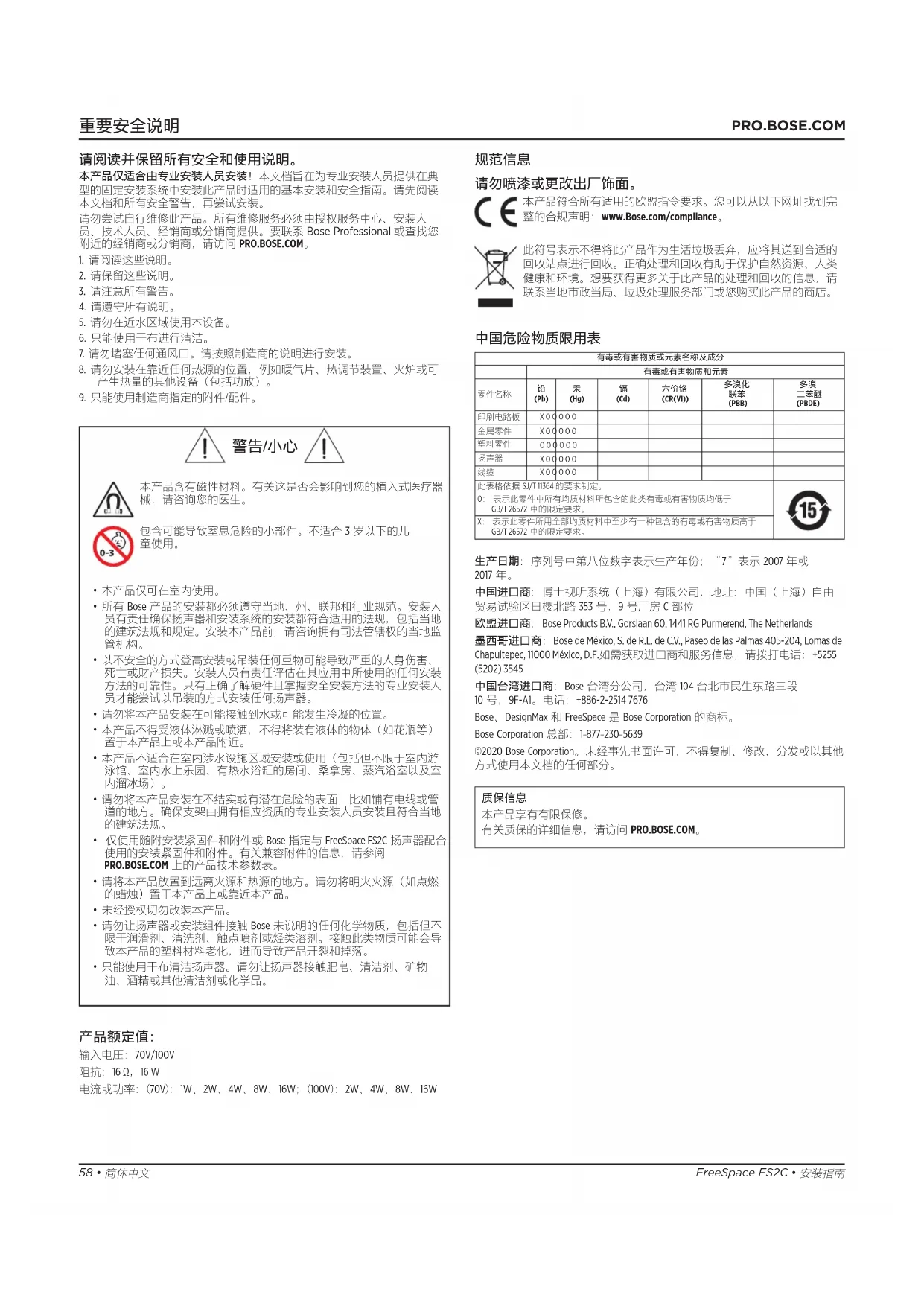 (Cr+6)多溴化聯苯 (PBB)多溴聯苯醚 (PBDE)印刷電路板 - ○ ○ ○ ○ ○金屬零件 - ○ ○ ○ ○ ○塑膠零件 ○ ○ ○ ○ ○ ○揚聲器 - ○ ○ ○ ○ ○連接線 - ○ ○ ○ ○ ○備註 1 : 「○」表示限制物質的濃度百分比含量未超過參考值。備註 2 :「–」表示限制物質屬於豁免項目範圍。 製造日期:序號第八位數代表製造年份;「7」代表 2007 或 2017。 中國進口商:Bose Electronics (Shanghai) Company Limited,中國 (上海) 自由貿易 試驗區日櫻北路 353 號 9 號廠房 C 部 歐盟進口商:Bose Products B.V., Gorslaan 60, 1441 RG Purmerend, The Netherlands 墨西哥進口商:Bose de México, S. de R.L. de C.V., Paseo de las Palmas 405-204, Lomas de Chapultepec, 11000 México, D.F. 進口商與服務資訊:+5255 (5202) 3545 台灣進口商:Bose 台灣分公司,台灣 104 台北市民生東路三段 10 號 9 樓 A1 室。電話號碼:+886-2-2514 7977 Bose、DesignMax 與 FreeSpace 為 Bose Corporation 的商標。 Bose Corporation 總部:1-877-230-5639 ©2020 Bose Corporation。未經事先書面許可,不得複製、修改、散佈或以其他 方式使用本資料的任何部分。