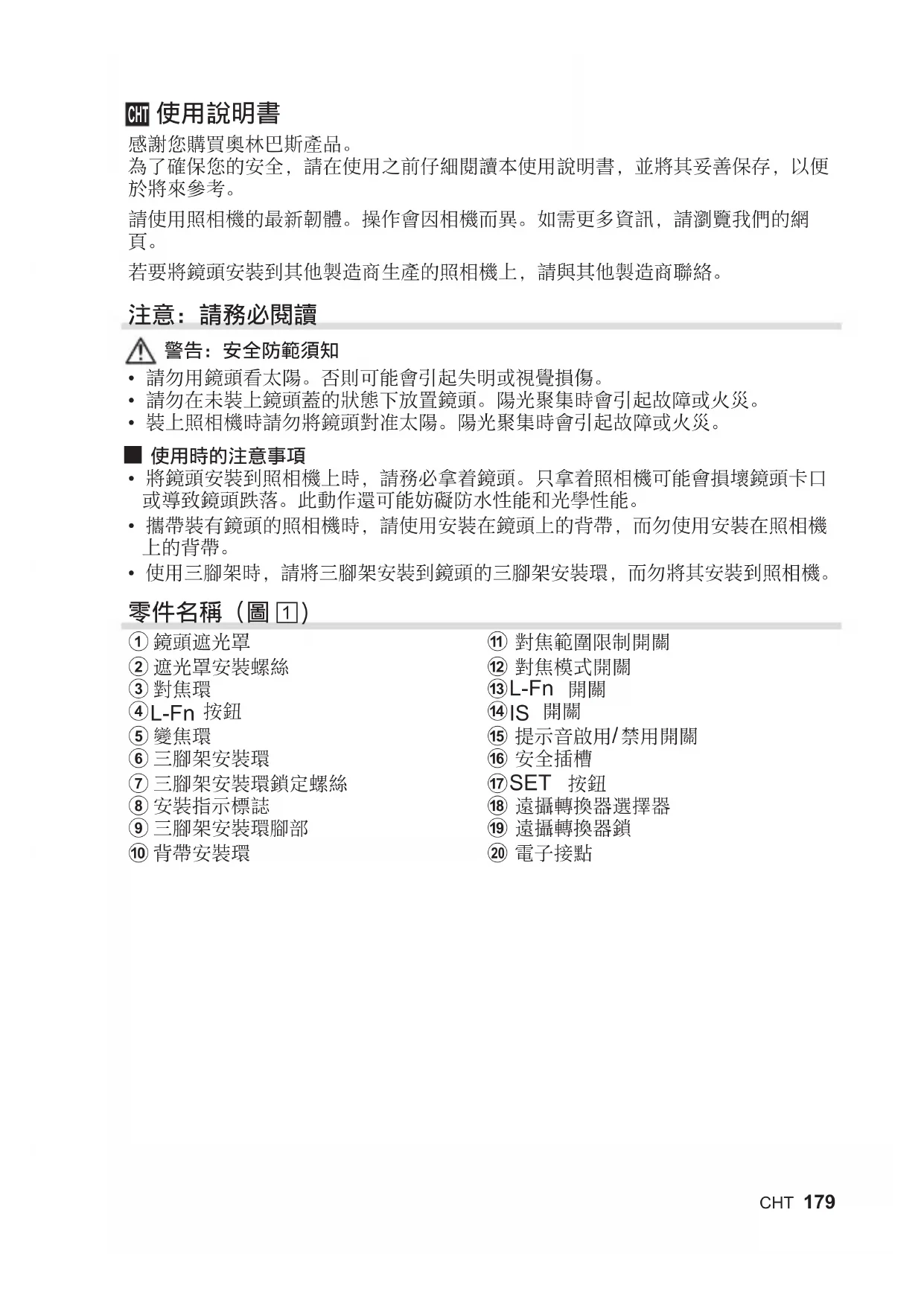 感謝您購買奧林巴斯產品。為了確保您的安全,請在使用之前仔細閱讀本使用說明書,並將其妥善保存,以便於將來參考。請使用照相機的最新韌體。操作會因相機而異。如需更多資訊,請瀏覽我們的網 若要將鏡頭安裝到其他製造商生產的照相機上,請與其他製造商聯絡。 警告:安全防範須知• 請勿用鏡頭看太陽。否則可能會引起失明或視覺損傷。• 請勿在未裝上鏡頭蓋的狀態下放置鏡頭。陽光聚集時會引起故障或火災。• 裝上照相機時請勿將鏡頭對准太陽。陽光聚集時會引起故障或火災。 使用時的注意事項• 將鏡頭安裝到照相機上時,請務必拿着鏡頭。只拿着照相機可能會損壞鏡頭卡口或導致鏡頭跌落。此動作還可能妨礙防水性能和光學性能。• 攜帶裝有鏡頭的照相機時,請使用安裝在鏡頭上的背帶,而勿使用安裝在照相機上的背帶。• 使用三腳架時,請將三腳架安裝到鏡頭的三腳架安裝環,而勿將其安裝到照相機。