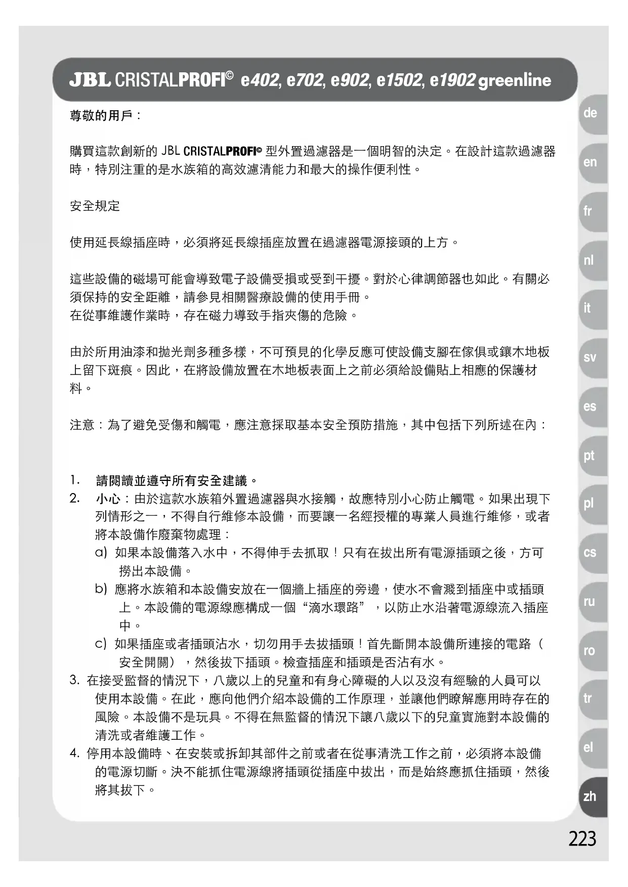 http://www.jbl.de/en/help-desk223 尊敬的用戶:購買這款創新的 JBL CRISTALPROFI 型外置過濾器是一個明智的決定。在設計這款過濾器時,特別注重的是水族箱的高效濾清能力和最大的操作便利性。安全規定 使用延長線插座時,必須將延長線插座放置在過濾器電源接頭的上方。這些設備的磁場可能會導致電子設備受損或受到干擾。對於心律調節器也如此。有關必須保持的安全距離,請參見相關醫療設備的使用手冊。在從事維護作業時,存在磁力導致手指夾傷的危險。由於所用油漆和拋光劑多種多樣,不可預見的化學反應可使設備支腳在傢俱或鑲木地板上留下斑痕。因此,在將設備放置在木地板表面上之前必須給設備貼上相應的保護材 注意:為了避免受傷和觸電,應注意採取基本安全預防措施,其中包括下列所述在內:1. 請閱讀並遵守所有安全建議。2. 小心:由於這款水族箱外置過濾器與水接觸,故應特別小心防止觸電。如果出現下列情形之一,不得自行維修本設備,而要讓一名經授權的專業人員進行維修,或者將本設備作廢棄物處理:a) 如果本設備落入水中,不得伸手去抓取!只有在拔出所有電源插頭之後,方可撈出本設備。 b) 應將水族箱和本設備安放在一個牆上插座的旁邊,使水不會濺到插座中或插頭上。本設備的電源線應構成一個“滴水環路”,以防止水沿著電源線流入插座 c) 如果插座或者插頭沾水,切勿用手去拔插頭!首先斷開本設備所連接的電路(安全開關),然後拔下插頭。檢查插座和插頭是否沾有水。3. 在接受監督的情況下,八歲以上的兒童和有身心障礙的人以及沒有經驗的人員可以使用本設備。在此,應向他們介紹本設備的工作原理,並讓他們瞭解應用時存在的風險。本設備不是玩具。不得在無監督的情況下讓八歲以下的兒童實施對本設備的清洗或者維護工作。4. 停用本設備時、在安裝或拆卸其部件之前或者在從事清洗工作之前,必須將本設備的電源切斷。決不能抓住電源線將插頭從插座中拔出,而是始終應抓住插頭,然後將其拔下。 JBL CRISTALPROFI