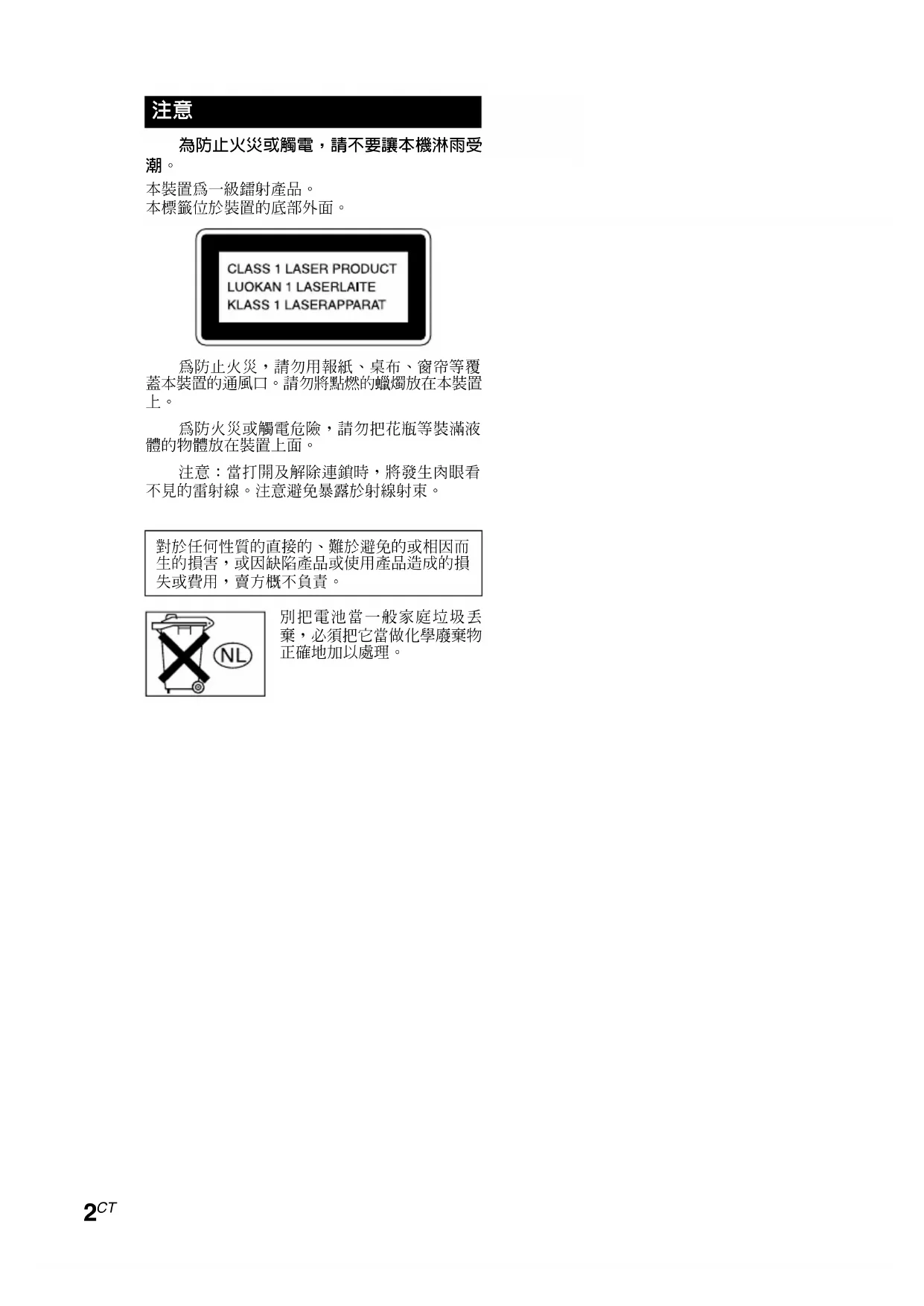 為防火災或觸電危險,請勿把花瓶等裝滿液 體的物體放在裝置上面。 注意:當打開及解除連鎖時,將發生肉眼看 不見的雷射線。注意避免暴露於射線射束。 對於任何性質的直接的、難於避免的或相因而 生的損害,或因缺陷產品或使用產品造成的損 失或費用,賣方概不負責。 別把電池當一般家庭垃圾丟 棄,必須把它當做化學廢棄物 正確地加以處理。3
