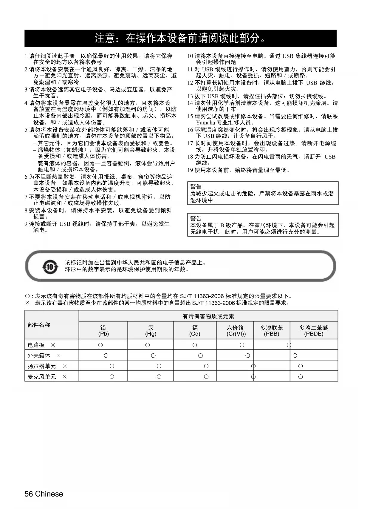 (PBDE) 电路板 ×○○○○○ 外壳箱体 ×○○○○○ 扬声器单元 ×○○○○○ 麦克风单元 ×○○○○○Chinese 57 感谢您购买 Yamaha PJP-20UR。 为了您的安全,请仔细阅读本手册内载列的所有安全指示和预防措施,并将它保存在安全的地方以备将来参考。