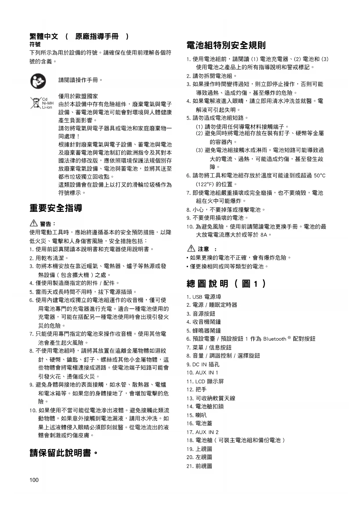 6. 使用內建電池或獨立的電池組運作的收音機,僅可使