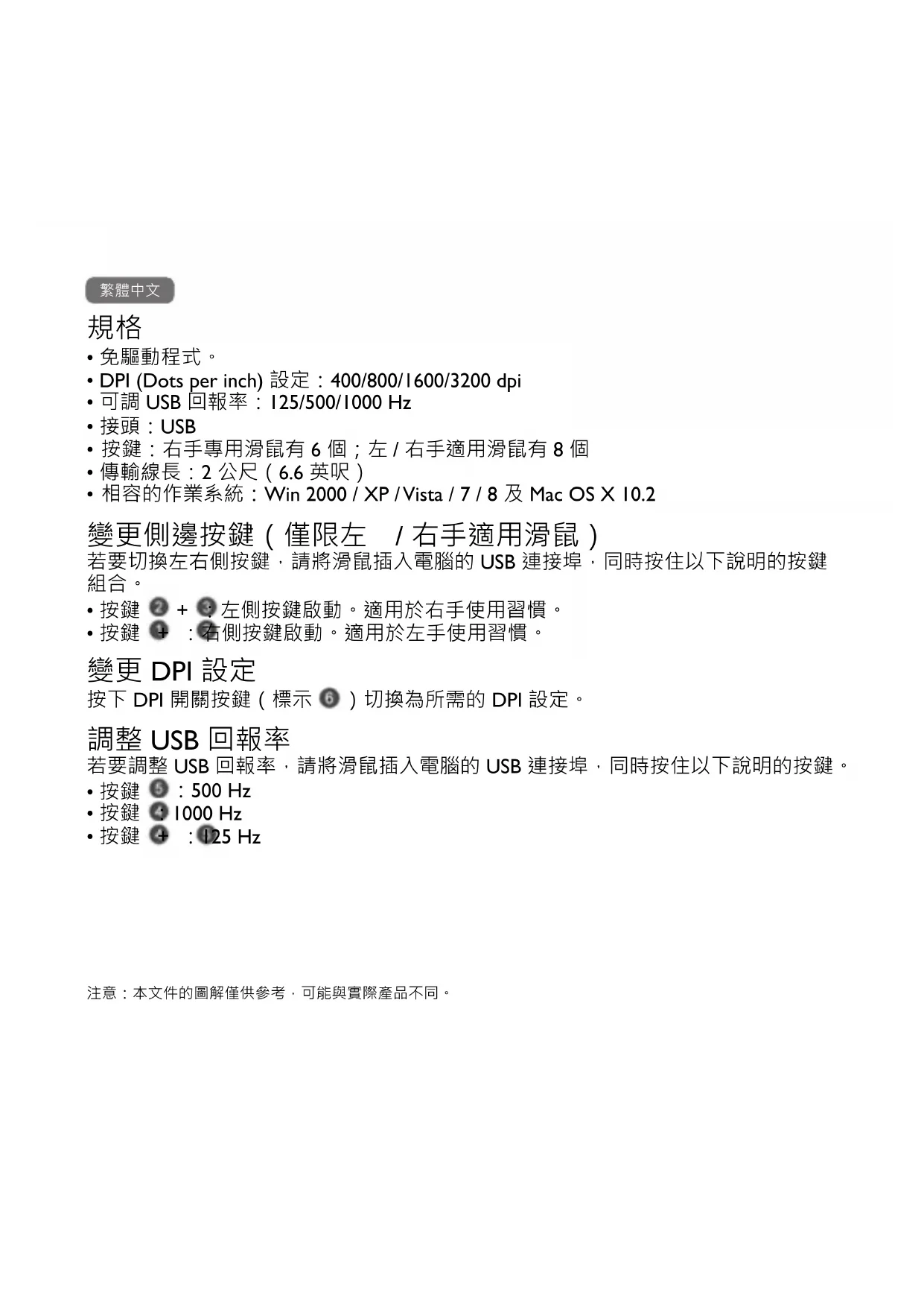 - 相容的作業系統:Win 2000 / XP / Vista / 7 / 8 及 Mac OS X 10.2 變更側邊按鍵(僅限左 / 右手適用滑鼠) 若要切換左右側按鍵,請將滑鼠插入電腦的 USB 連接埠,同時按住以下說明的按鍵