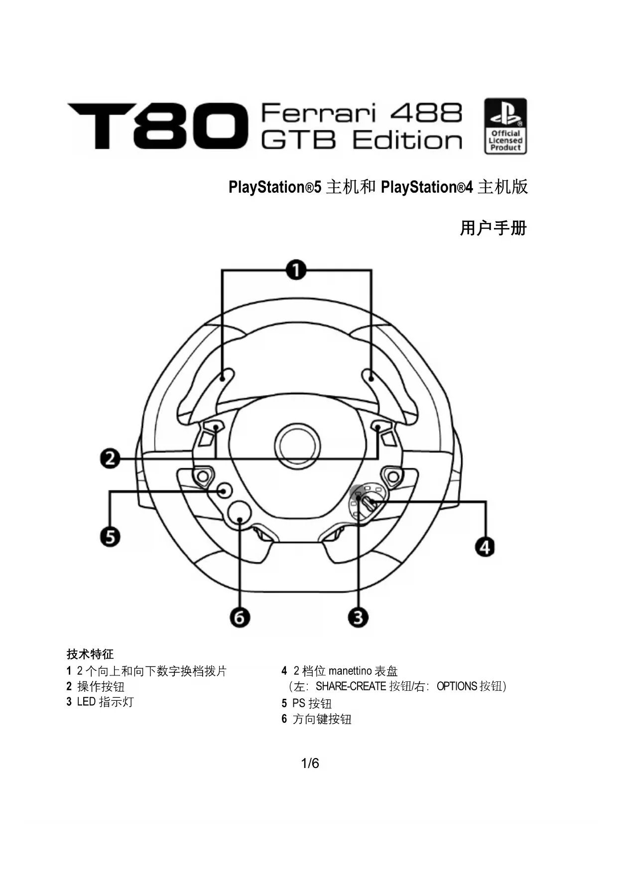 1 2 个向上和向下数字换档拨片 2 操作按钮 3 LED 指示灯 4 2 档位 manettino 表盘 (左:SHARE-CREATE 按钮/右:OPTIONS 按钮) 5 PS 按钮 6 方向键按钮2/6