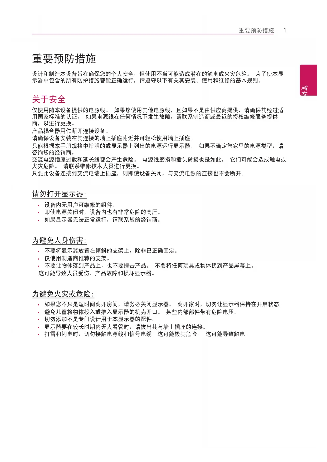 设计和制造本设备旨在确保您的个人安全,但使用不当可能造成潜在的触电或火灾危险。 为了使本显 示器中包含的所有防护措施都能正确运行,请遵守以下有关其安装、使用和维修的基本规则。