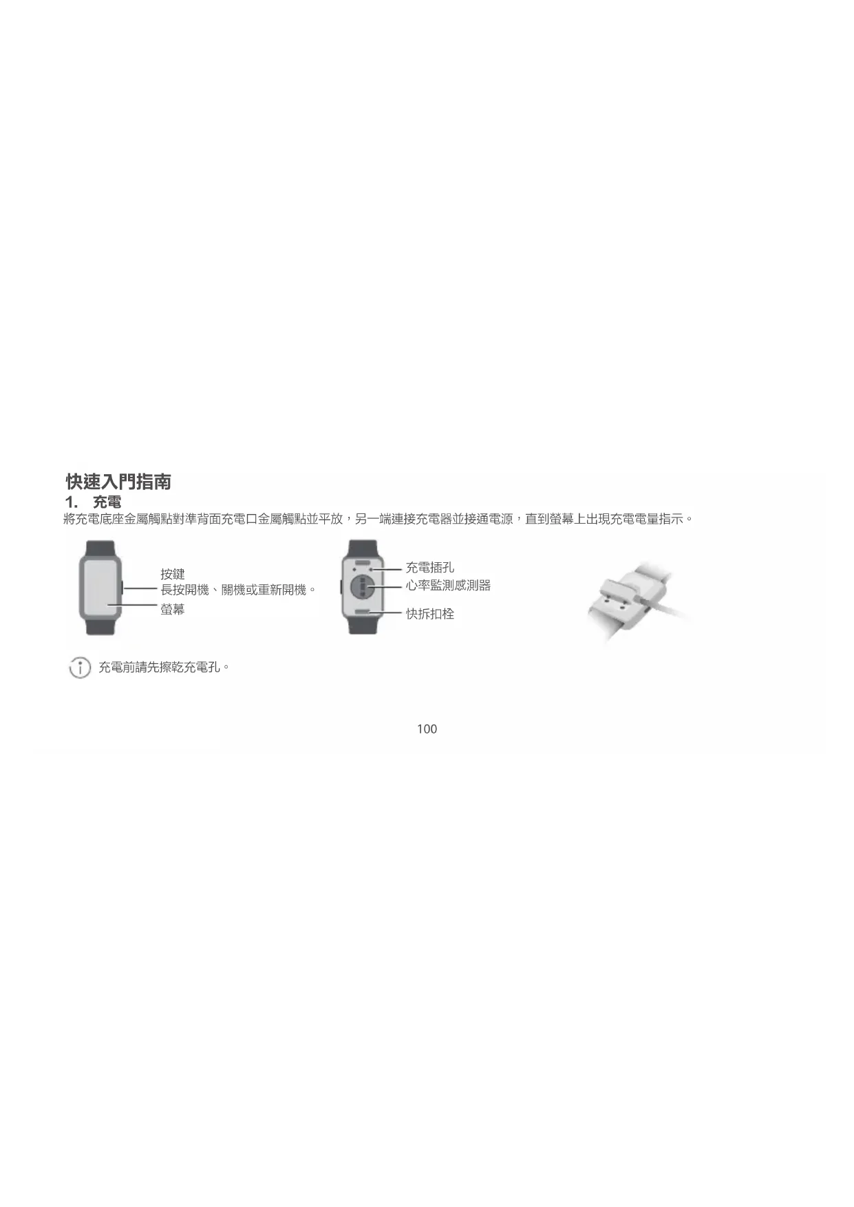 在 Huawei Health App 裝置列表中選取您需要連接的裝置,遵循 App 提示完成連線。 查看 Huawei Health App 中的使用指南,取得連線指引、功能介紹及使用技巧。 本產品非醫療器械,所提供的健康資料及建議僅供參考,不可作為診斷和治療的依據。充電底座不防水,充電時請保持底座連接埠、 金屬觸點及裝置等乾燥。由於個人體質差異,若佩戴時感到皮膚不適,請停止佩戴並諮詢醫生。102