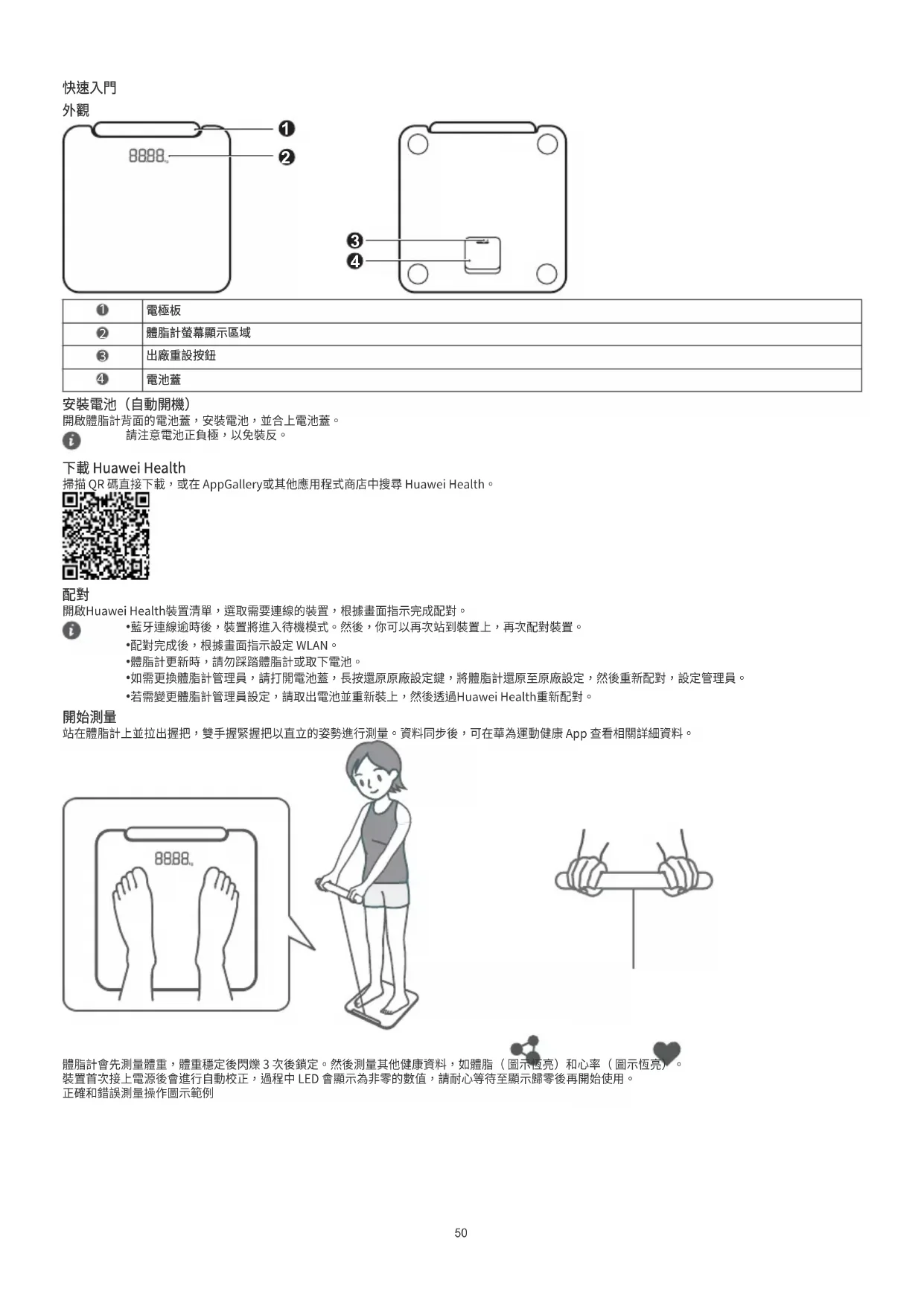開啟體脂計背面的電池蓋,安裝電池,並合上電池蓋。 請注意電池正負極,以免裝反。 下載 Huawei Health 掃描 QR 碼直接下載,或在 AppGallery或其他應用程式商店中搜尋 Huawei Health。