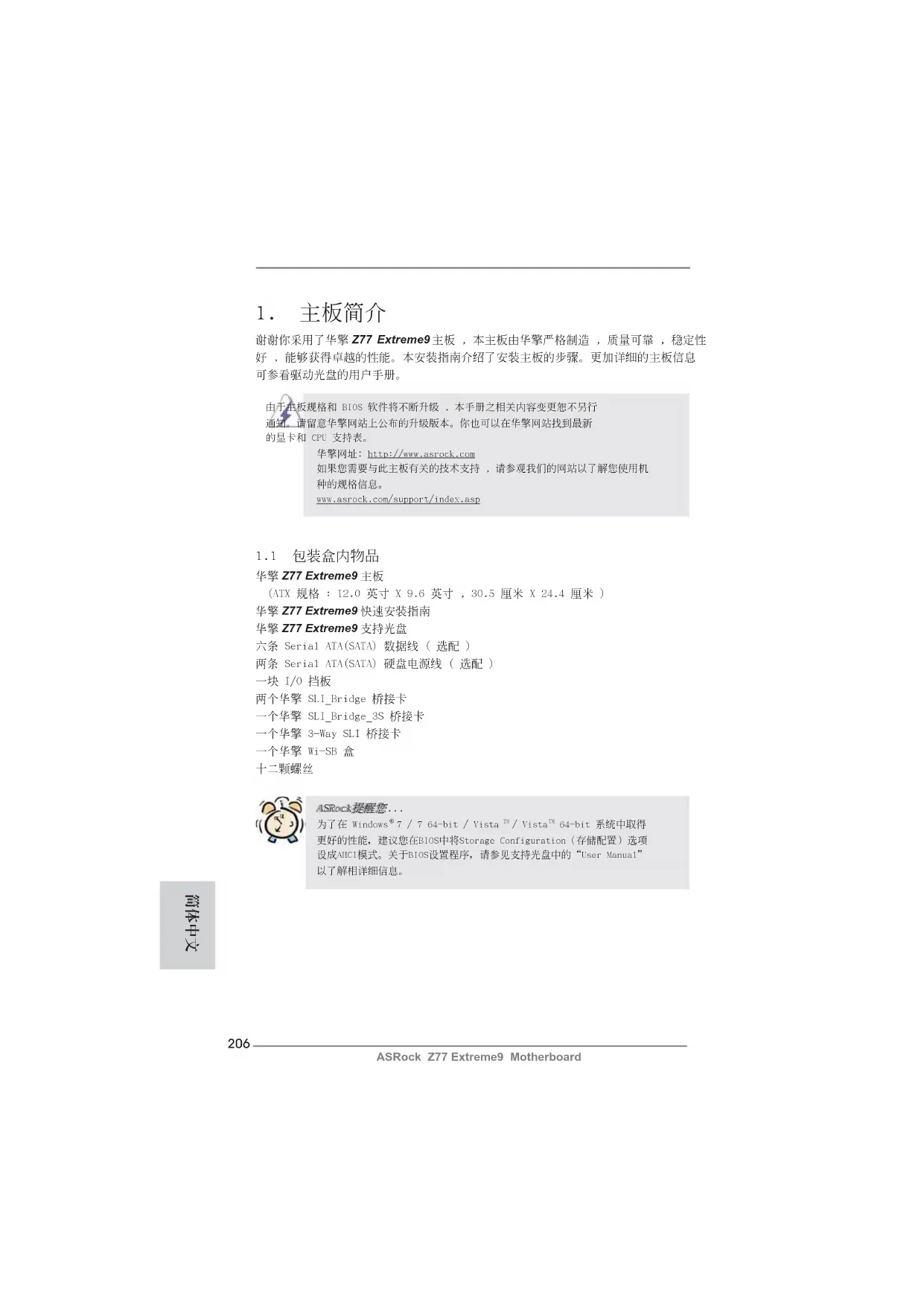 7 / 7 64-bit / Vista / Vista 64-bit 系統中取得更好的性能,建議您在BIOS中將Storage Configuration(存儲配置)選項設成AHCI模式。關于BIOS設置程序,請參見支持光盤中的“User Manual”以了解相詳細信息。 簡體中文207 ASRock Z77 Extreme9 Motherboard