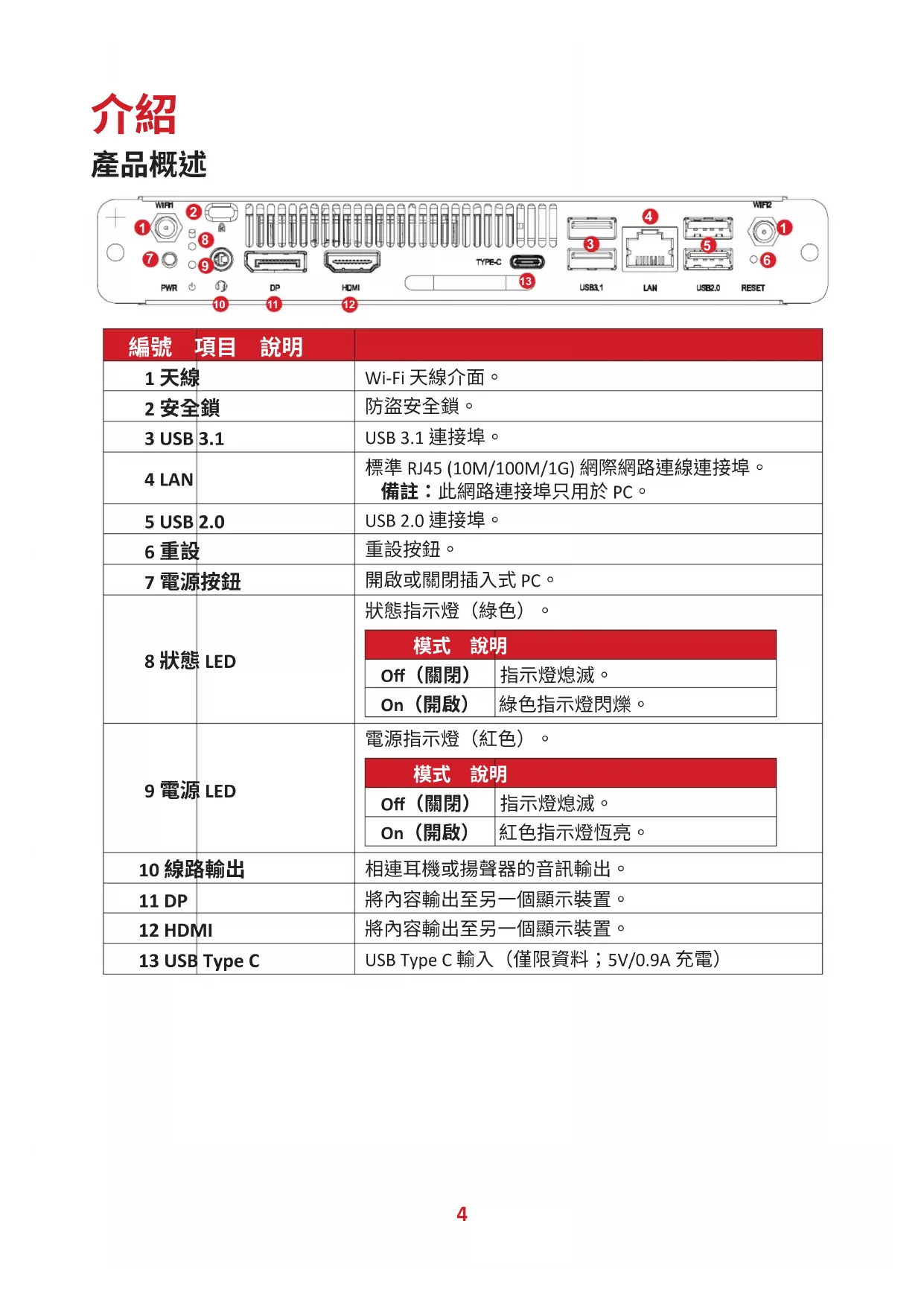 Off(關閉) 指示燈熄滅。 On(開啟) 紅色指示燈恆亮。 10 線路輸出 相連耳機或揚聲器的音訊輸出。 11 DP 將內容輸出至另一個顯示裝置。 12 HDMI 將內容輸出至另一個顯示裝置。 13 USB Type C USB Type C 輸入(僅限資料;5V/0.9A 充電)5