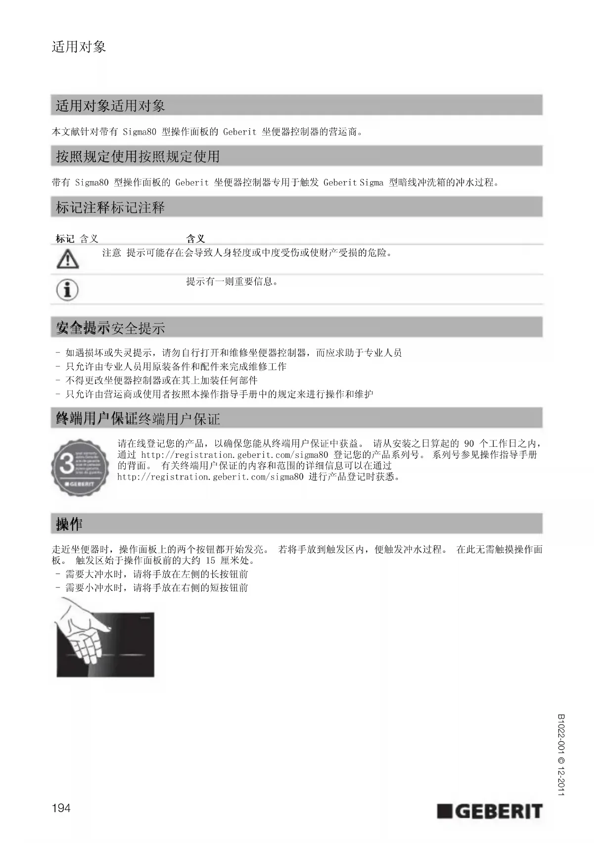 B1022-001 © 12-2011 本文献针对带有 Sigma80 型操作面板的 Geberit 坐便器控制器的营运商。 带有 Sigma80 型操作面板的 Geberit 坐便器控制器专用于触发 Geberit Sigma 型暗线冲洗箱的冲水过程。 - 如遇损坏或失灵提示,请勿自行打开和维修坐便器控制器,而应求助于专业人员 - 只允许由专业人员用原装备件和配件来完成维修工作 - 不得更改坐便器控制器或在其上加装任何部件 - 只允许由营运商或使用者按照本操作指导手册中的规定来进行操作和维护 请在线登记您的产品,以确保您能从终端用户保证中获益。 请从安装之日算起的 90 个工作日之内, 通过 http://registration.geberit.com/sigma80 登记您的产品系列号。 系列号参见操作指导手册 的背面。 有关终端用户保证的内容和范围的详细信息可以在通过 http://registration.geberit.com/sigma80 进行产品登记时获悉。 走近坐便器时,操作面板上的两个按钮都开始发亮。 若将手放到触发区内,便触发冲水过程。 在此无需触摸操作面 板。 触发区始于操作面板前的大约 15 厘米处。 - 需要大冲水时,请将手放在左侧的长按钮前 - 需要小冲水时,请将手放在右侧的短按钮前